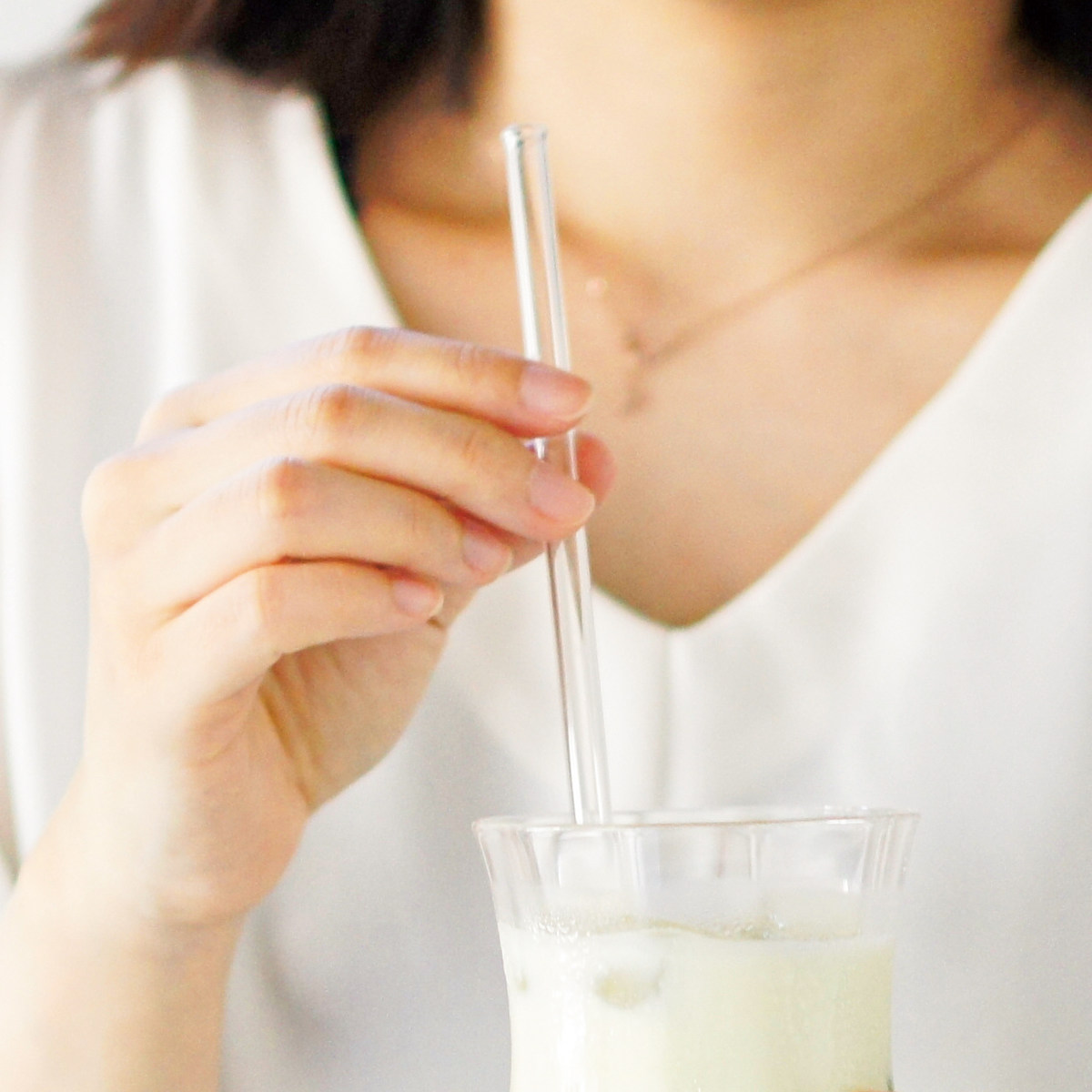 少し背の高いグラスや、500ml紙パックに丁度いいサイズの20cmのガラスストローと専用ブラシ、持ち運びケースのセット商品です。ガラス製のストローは他素材に比べて飲み物の味や香りを損なうことなく、ひんやりと滑らかな触り心地で、ドリンクを味わうひとときをより上質なものにしてくれます。