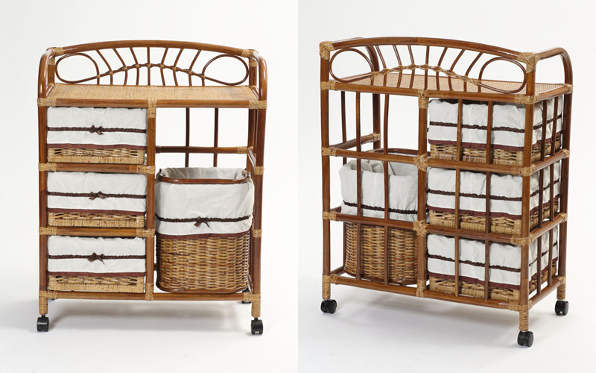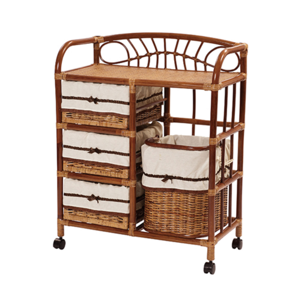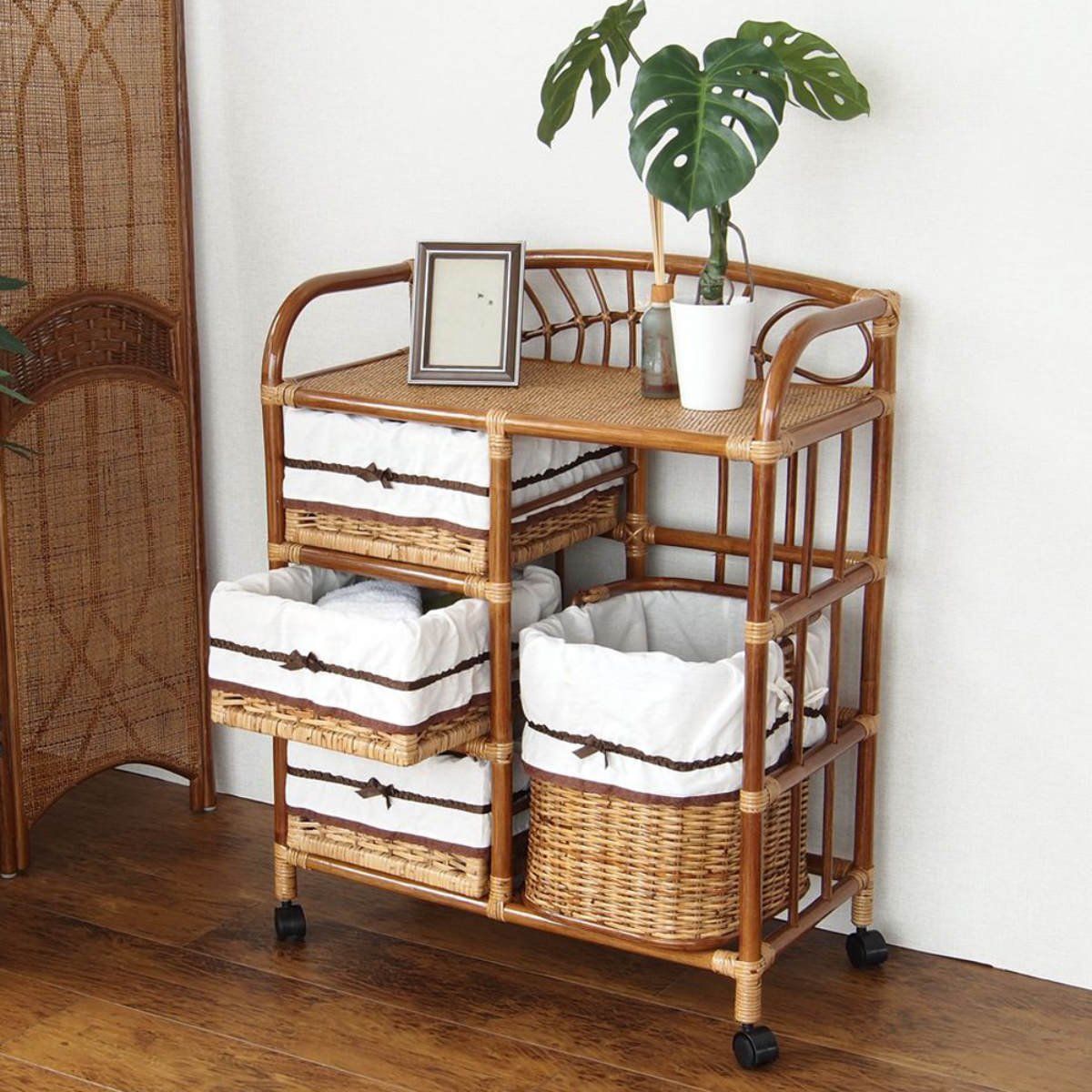 通気性が良いラタン製のランドリーチェストです。3段の引き出しと、中身を入れたまま取り出して使える持ち手付きバスケットの組み合わせで、用途に合わせて様々な使い方ができます。キャスター付きなので、お掃除や模様替えの際の移動も楽ちんです。