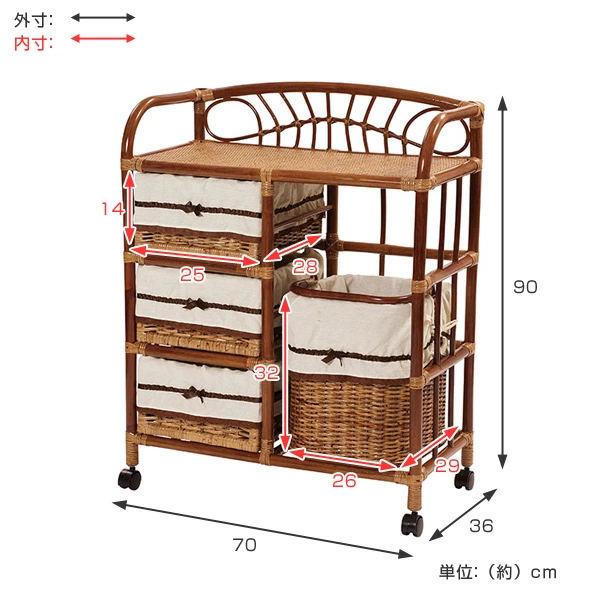| サイズ | 約 幅70×奥行36×高さ90(cm) バスケット(大)内寸:約 幅26×奥行29×高さ32(cm) バスケット(小)内寸:約 幅25×奥行28×高さ14(cm) |