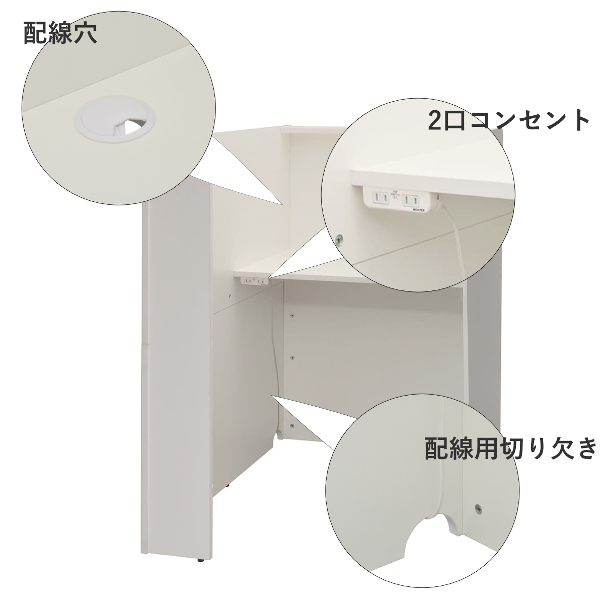 パーソナルブースは、天板にキャップ付き配線穴、天板下方には配線用切り欠きを標準装備しており、モニターやデスクライト等の設置に対応しています。また、天板左下にあらかじめ電源タップを備えた2ヶ口コンセントが付いております。