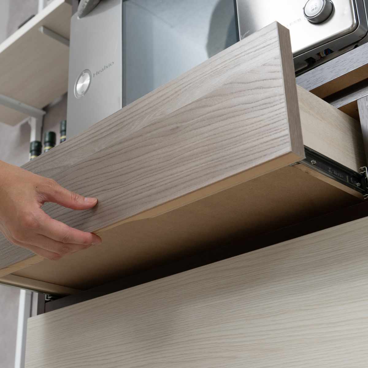 引出しは全段フルスライドレールを採用。奥の物まで見やすく出し入れがしやすいです。スライドレールも最後まで引き出せるので炊飯器のふたもしっかりと開きます。