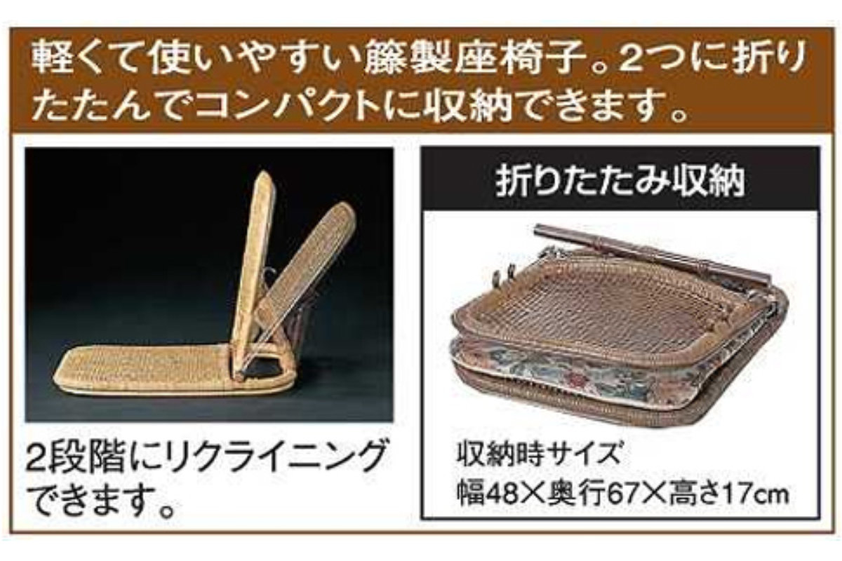 軽くて持ち運びが便利な籐製座椅子です。2段階でリクライニング可能で、折りたたんでコンパクトに収納できます。