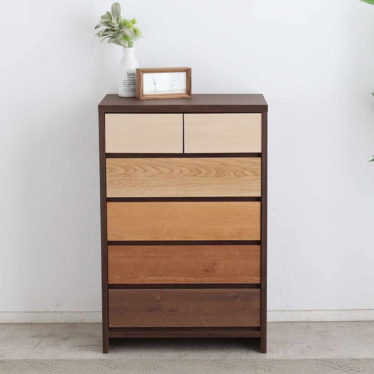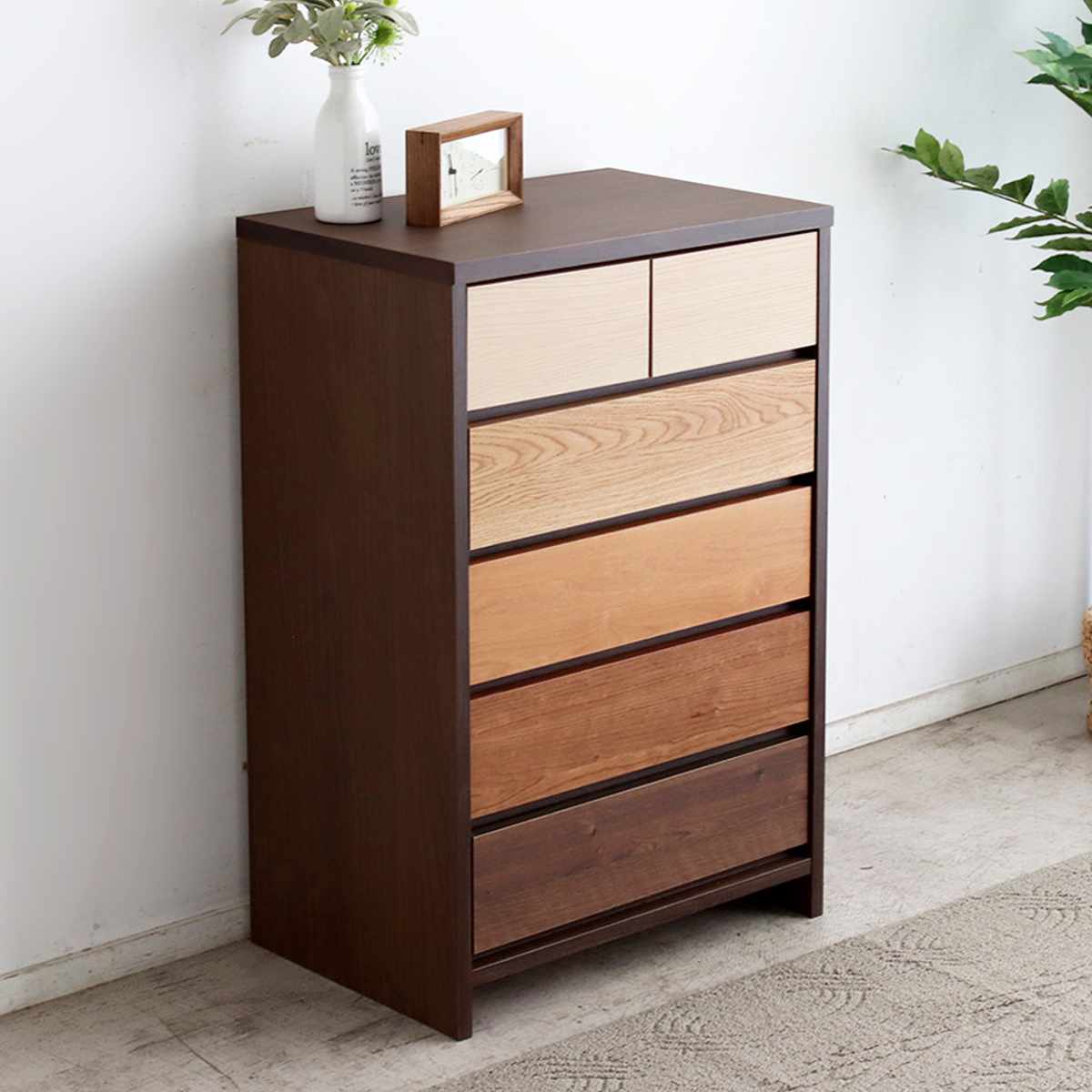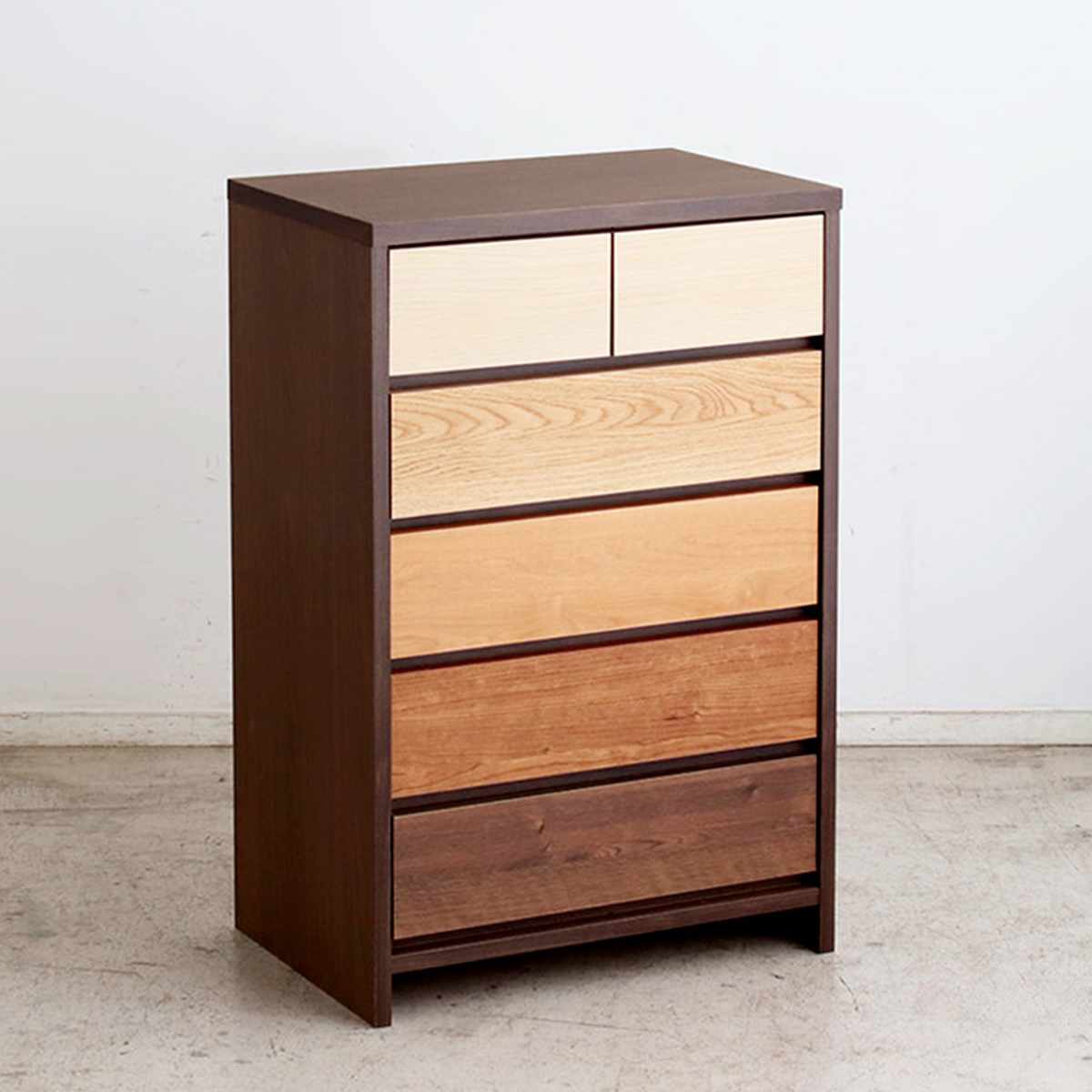 あえて違う木材カラーをグラデーションになるように設えた意匠性が目を引くチェストです。和室や洋室など置く場所を選ばず、様々なテイストのインテリアにマッチします。