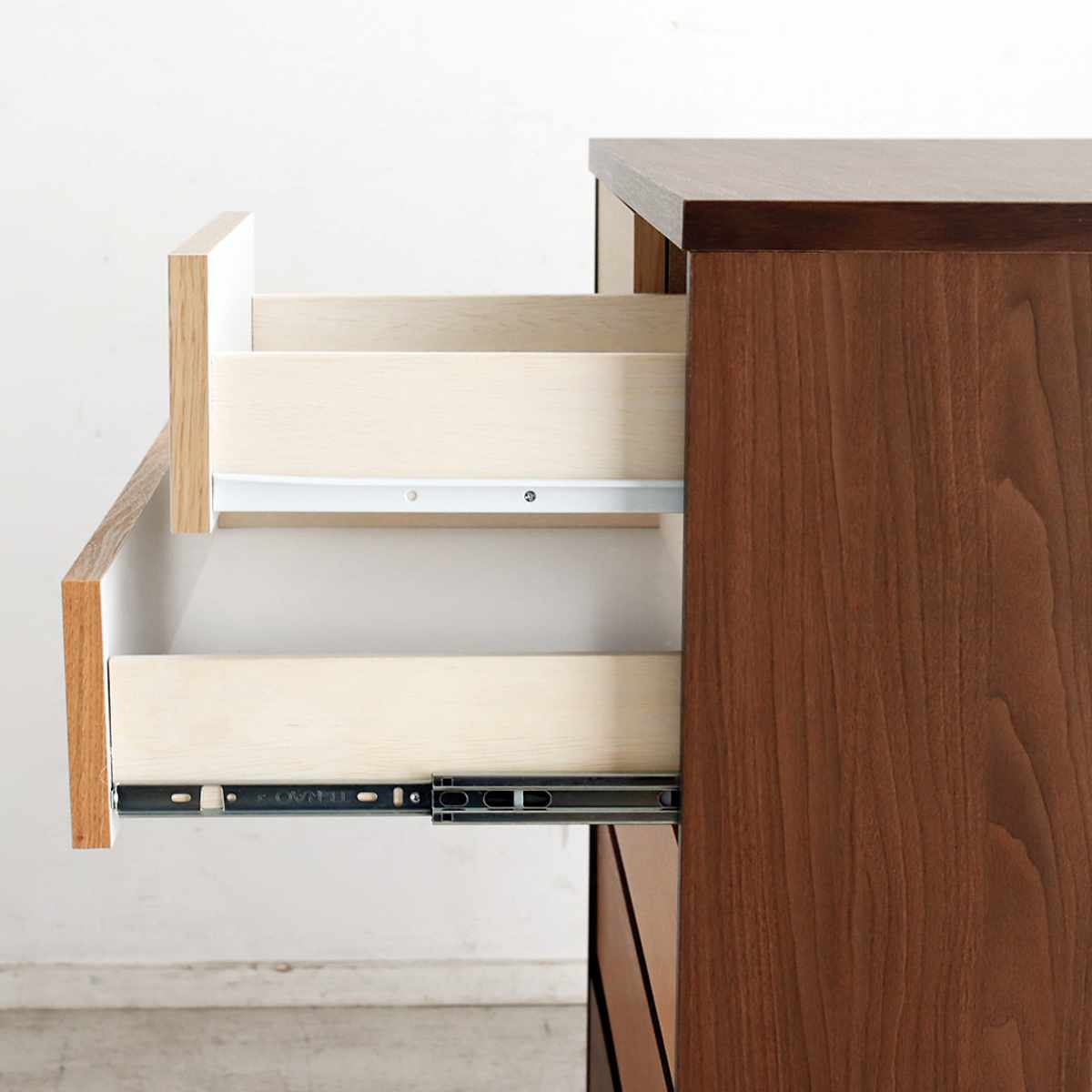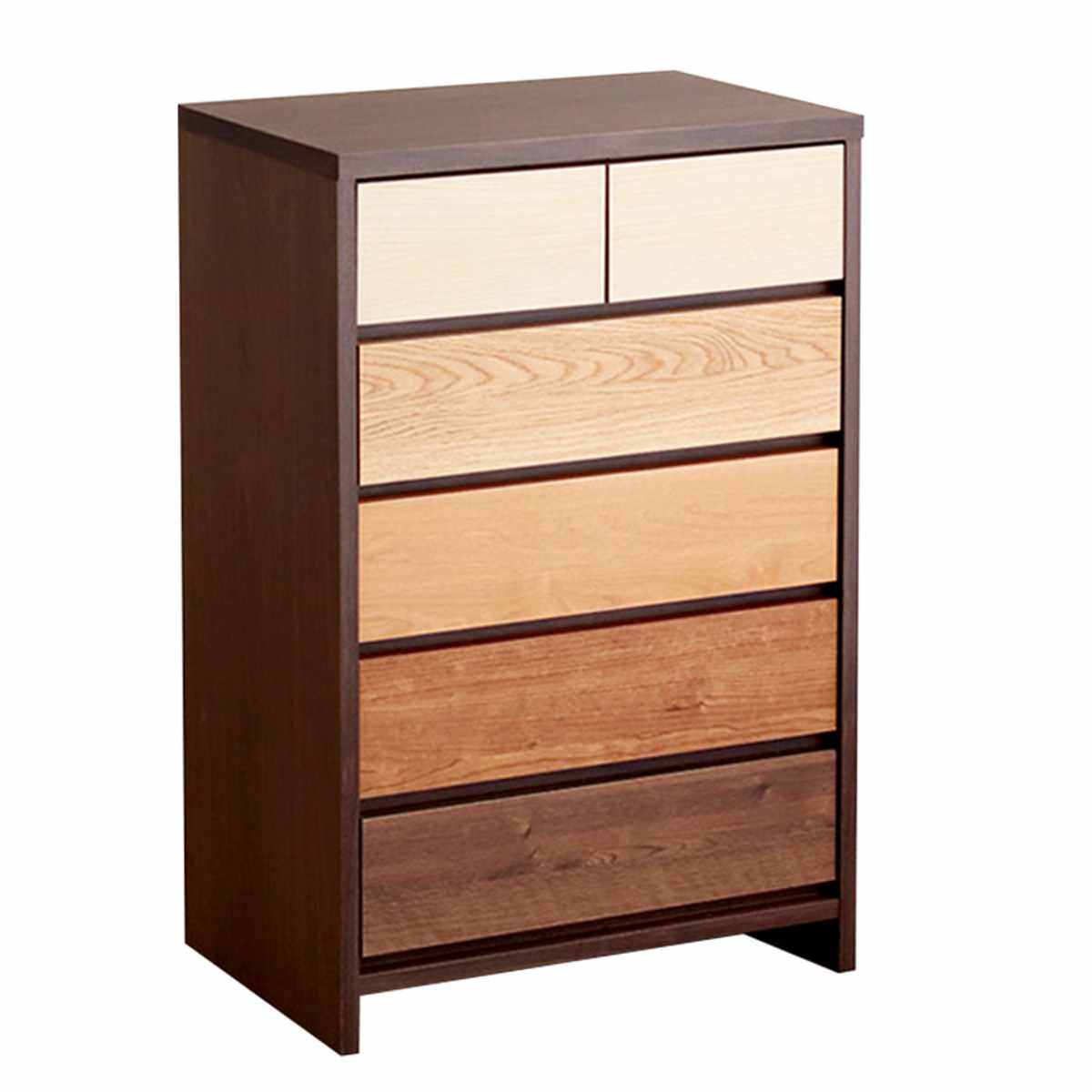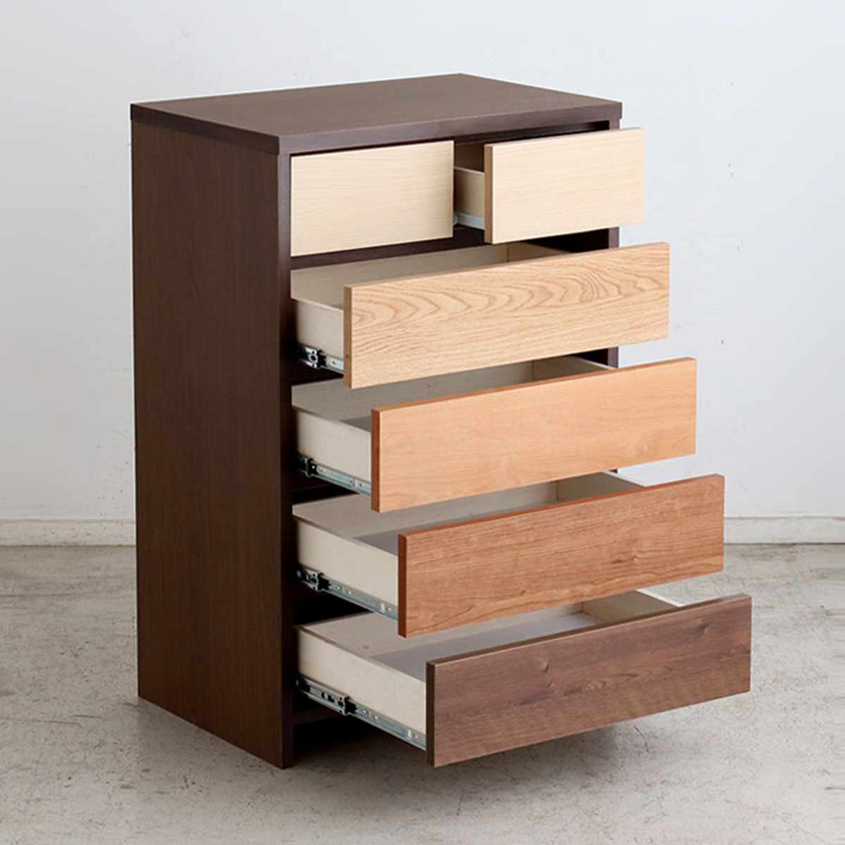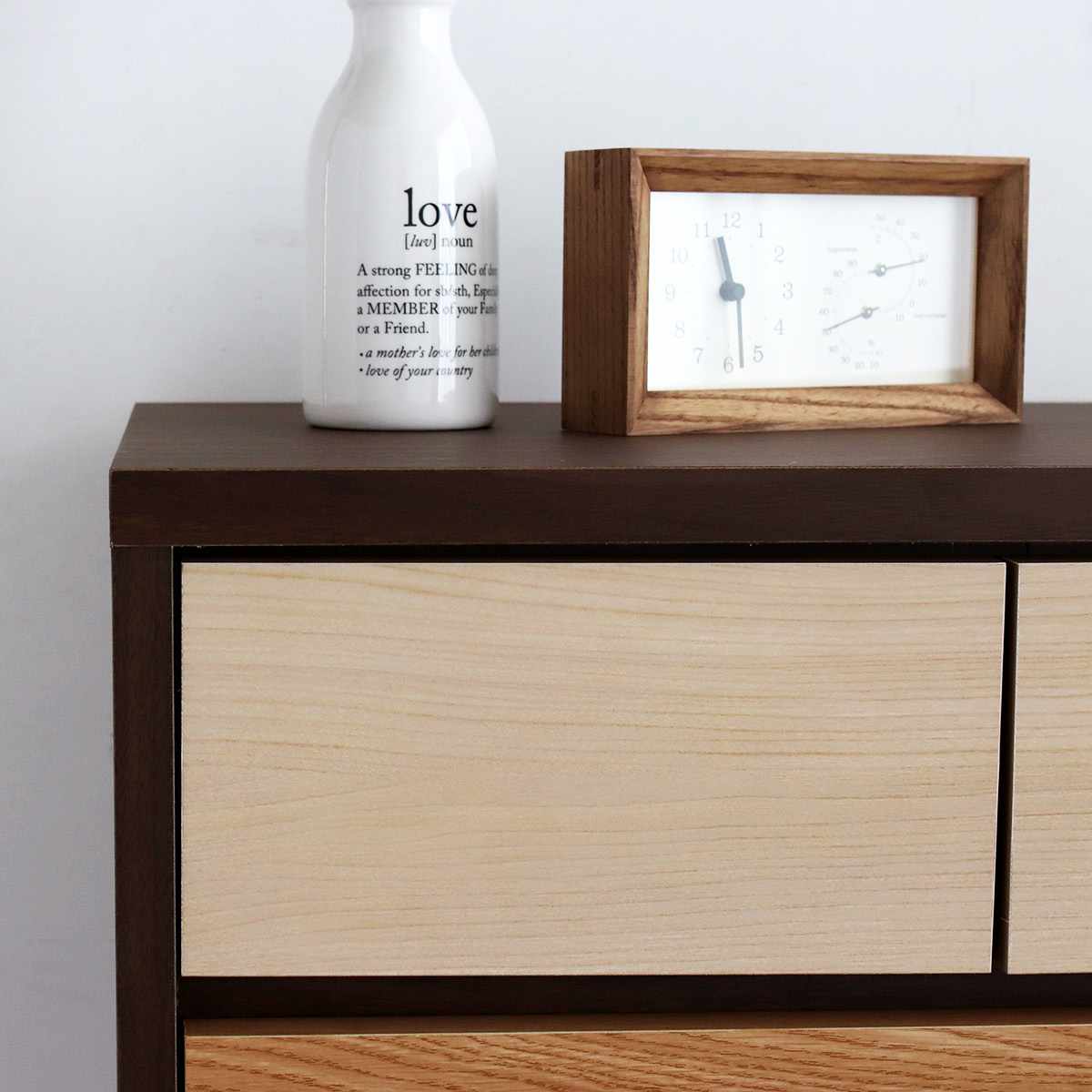 あえて違う木材カラーをグラデーションになるように設えた意匠性が目を引くチェストです。和室や洋室など置く場所を選ばず、様々なテイストのインテリアにマッチします。