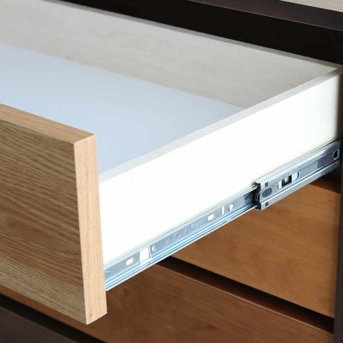 最上段のみ通常のスライドレール、他の段は全てフルスライドレール仕様で奥までしっかり見渡せます。重い衣類や厚手のセーターもスムーズに取り出せます。