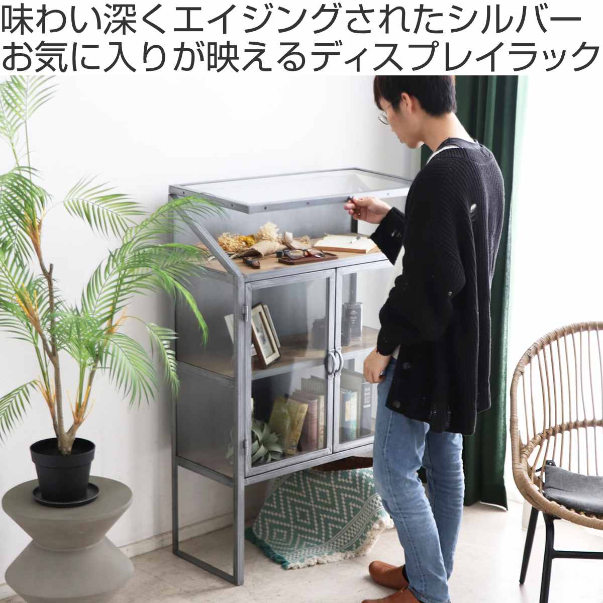 ディスプレイラック 幅80cm アンティーク調 ガラス 完成品 ( ショーケース 飾り棚 ラック 棚 ガラス製 フラップ扉 什器 エイジング加工 コレクションケース パイン古材 )