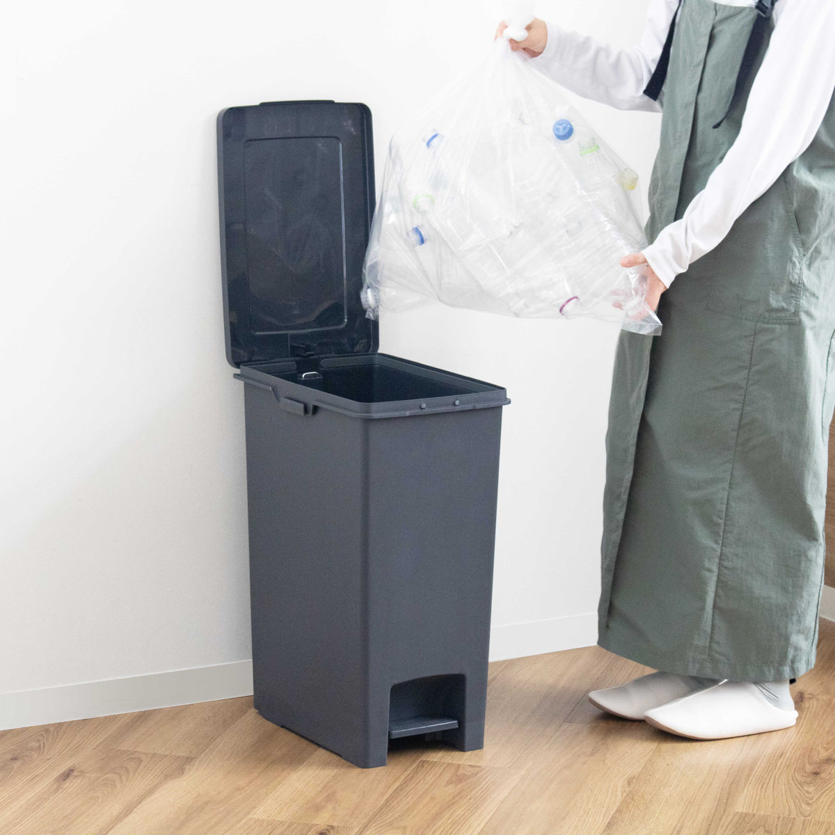 足で軽く踏むだけでサッと開くペダル式ゴミ箱です。手がふさがっていたり汚れている時でもフタを開けられるため、衛生的でとても便利です。スリッパを履いたままでも踏みやすい大きめのペダルです。
