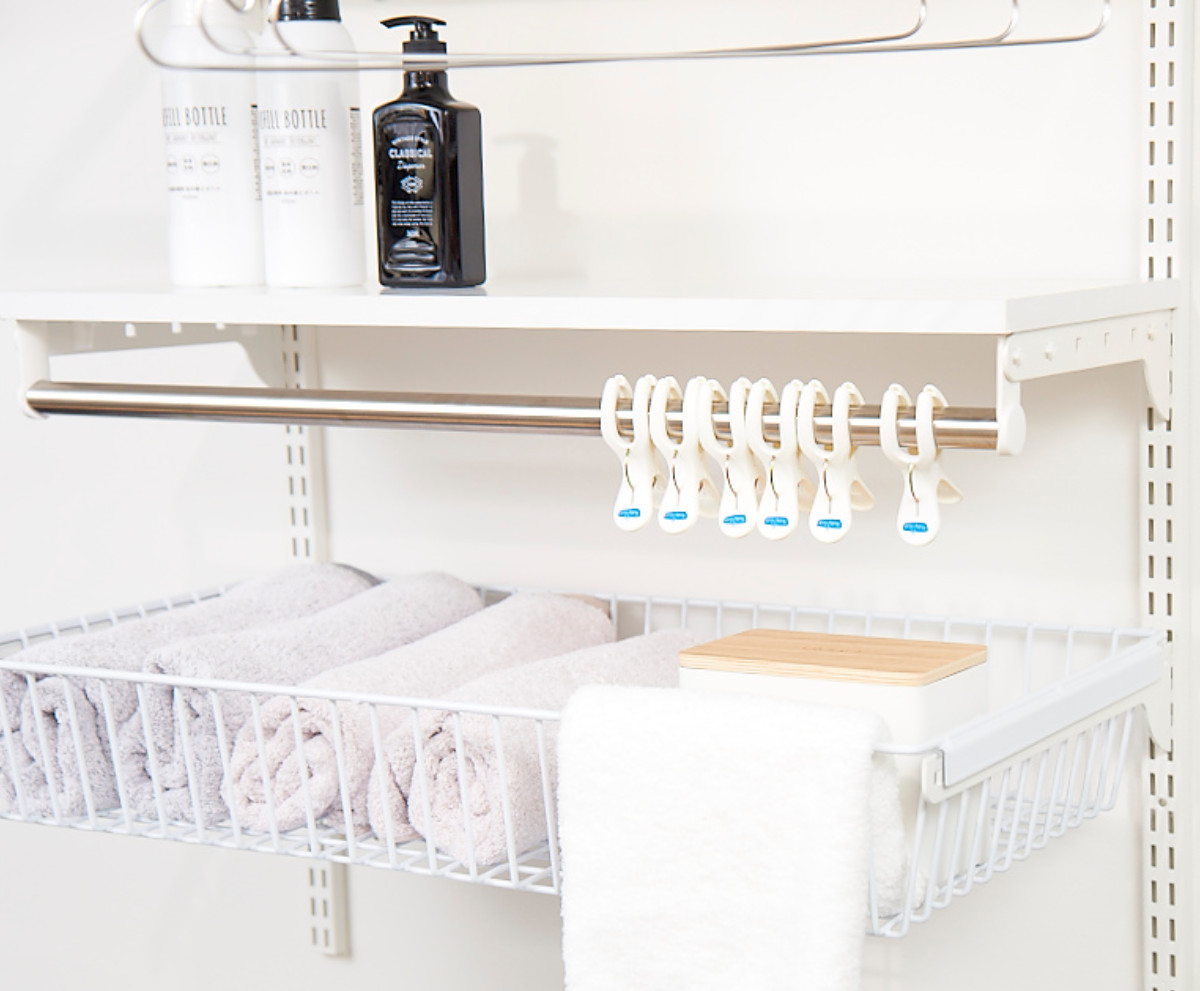 棚には小物を、パイプにはハンガーやタオルを掛けるなどランドリーやクローゼット収納に最適です。
