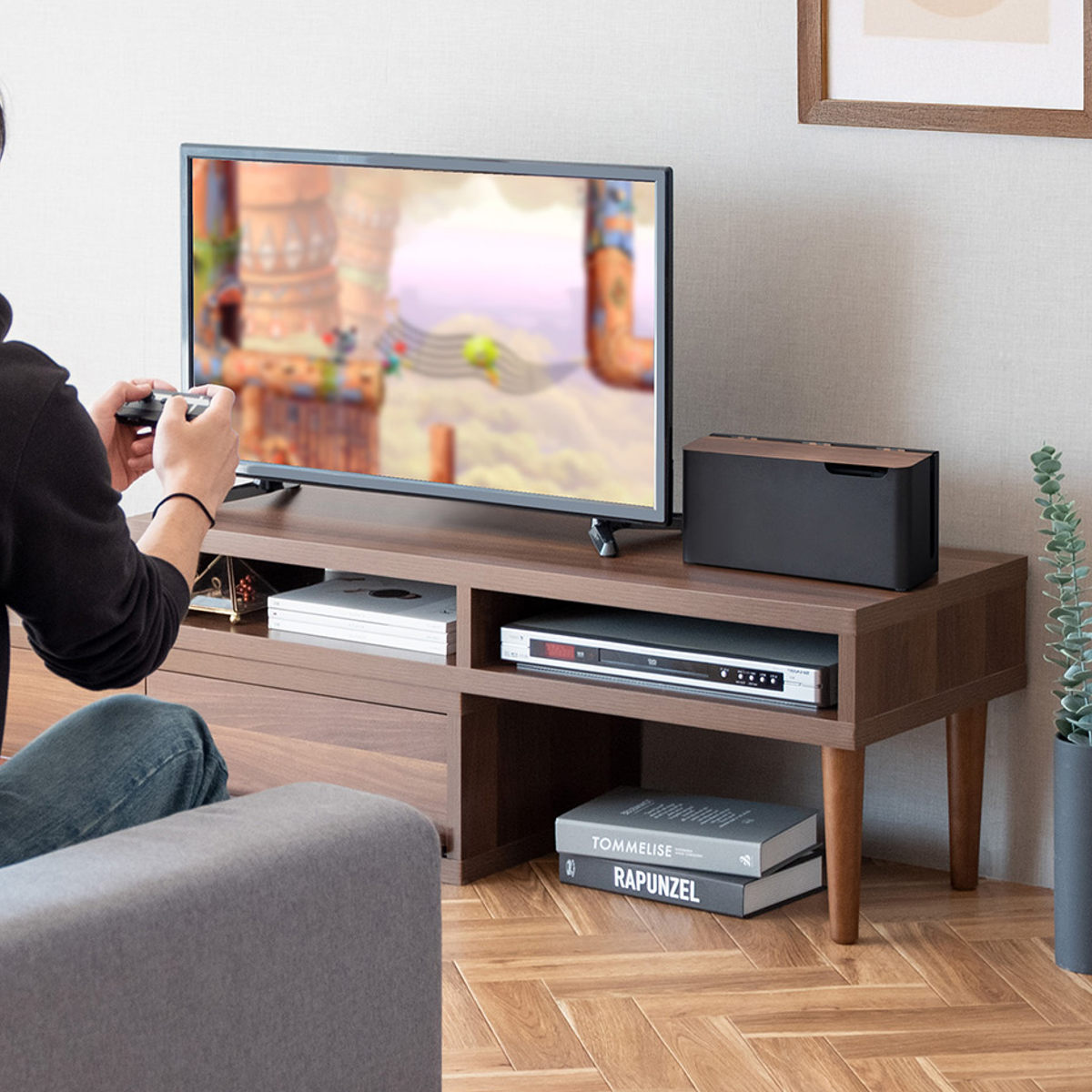 テレビ台の上に置いて使えるのはもちろん、背面にはネジ穴があり、壁掛けでもお使いいただけます。壁掛けにすれば、空いた壁面を有効活用できるうえ、テレビ台の掃除もラクになるのでおすすめです。