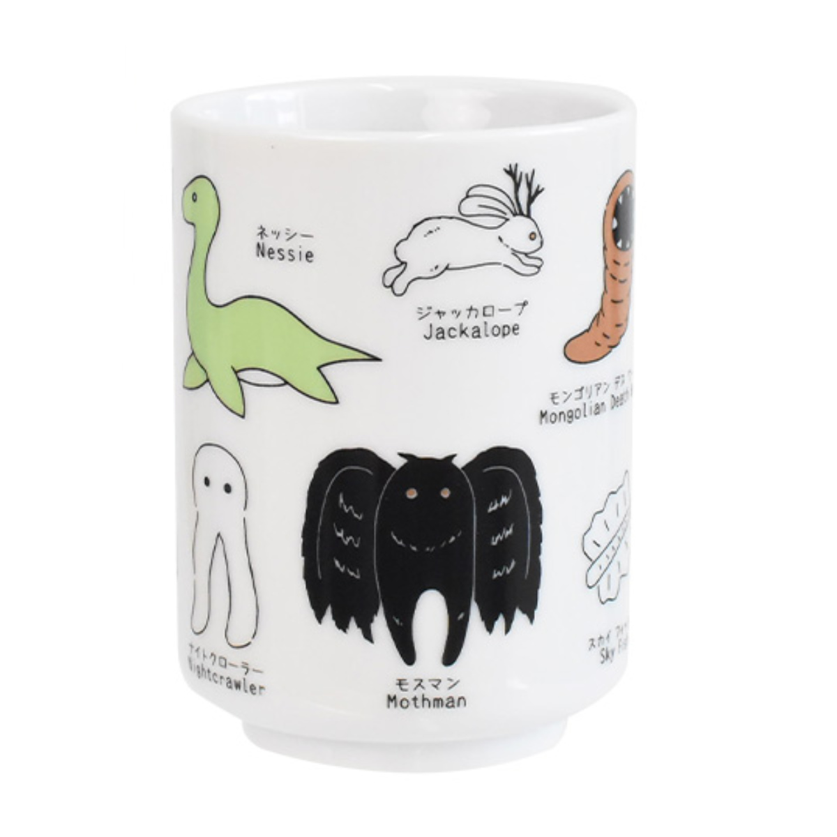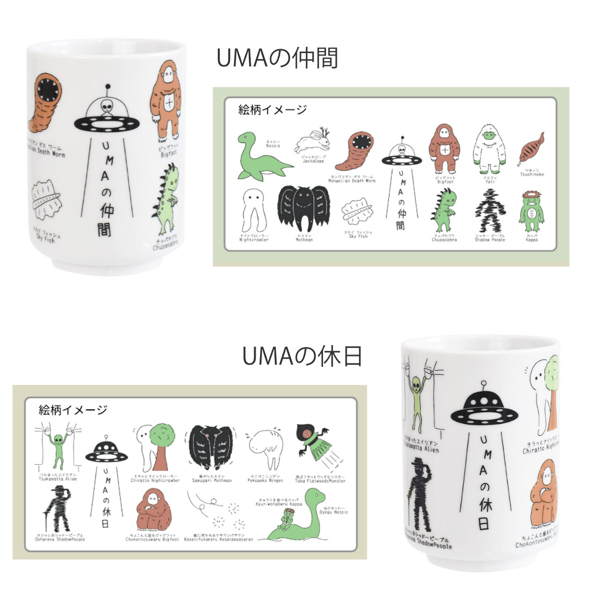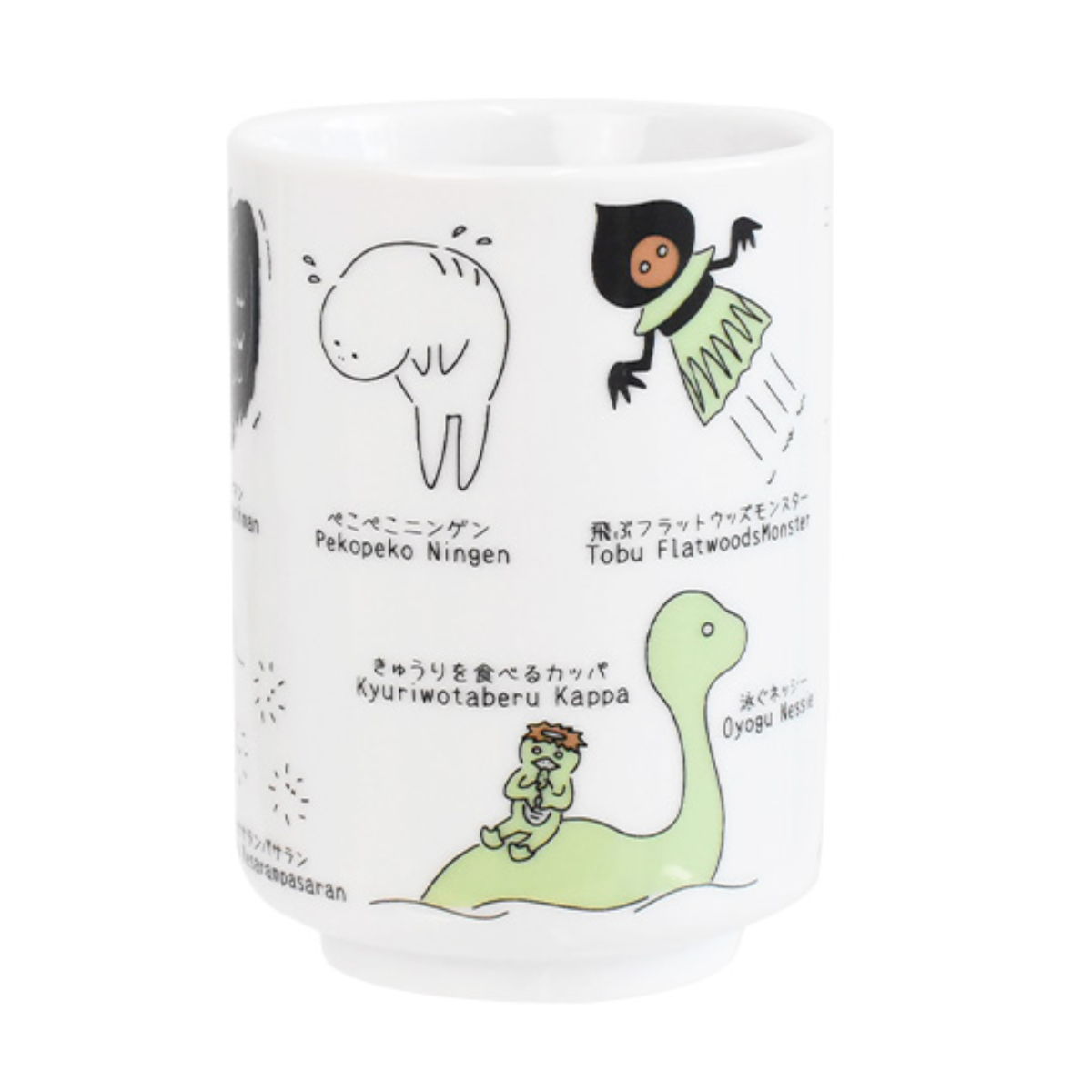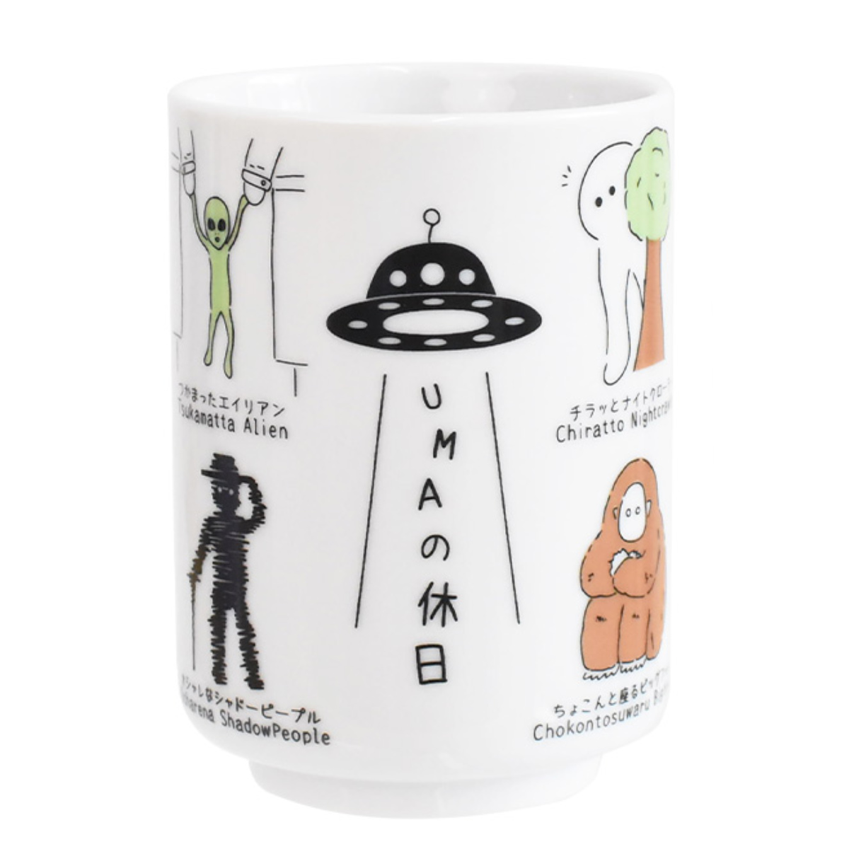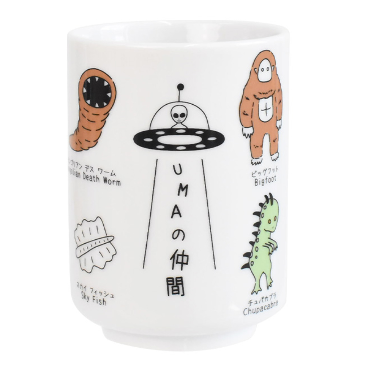 個性的なUMA(未確認生物)の仲間たちがぐるりと一周描かれたデザインの湯呑みです。満水容量280mlで手になじみやすいサイズで、お茶の時間を楽しませてくれるアイテムです。