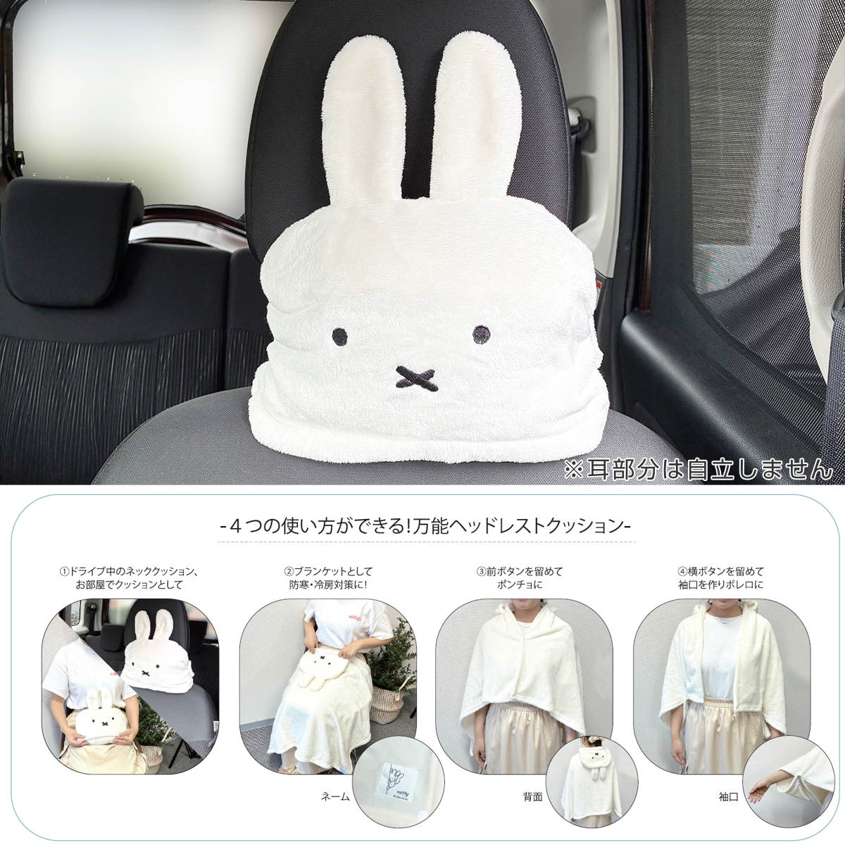 ミッフィーのお顔をかたどったヘッドレストクッションです。ふんわりとした弾力で首や頭をやさしく支え、長時間のドライブも快適に過ごせます。中にはブランケットが入っており、広げればひざ掛けやポンチョとしても使える便利な4WAYタイプです。見た目のかわいさと使いやすさを兼ね備えた癒しのアイテムです。