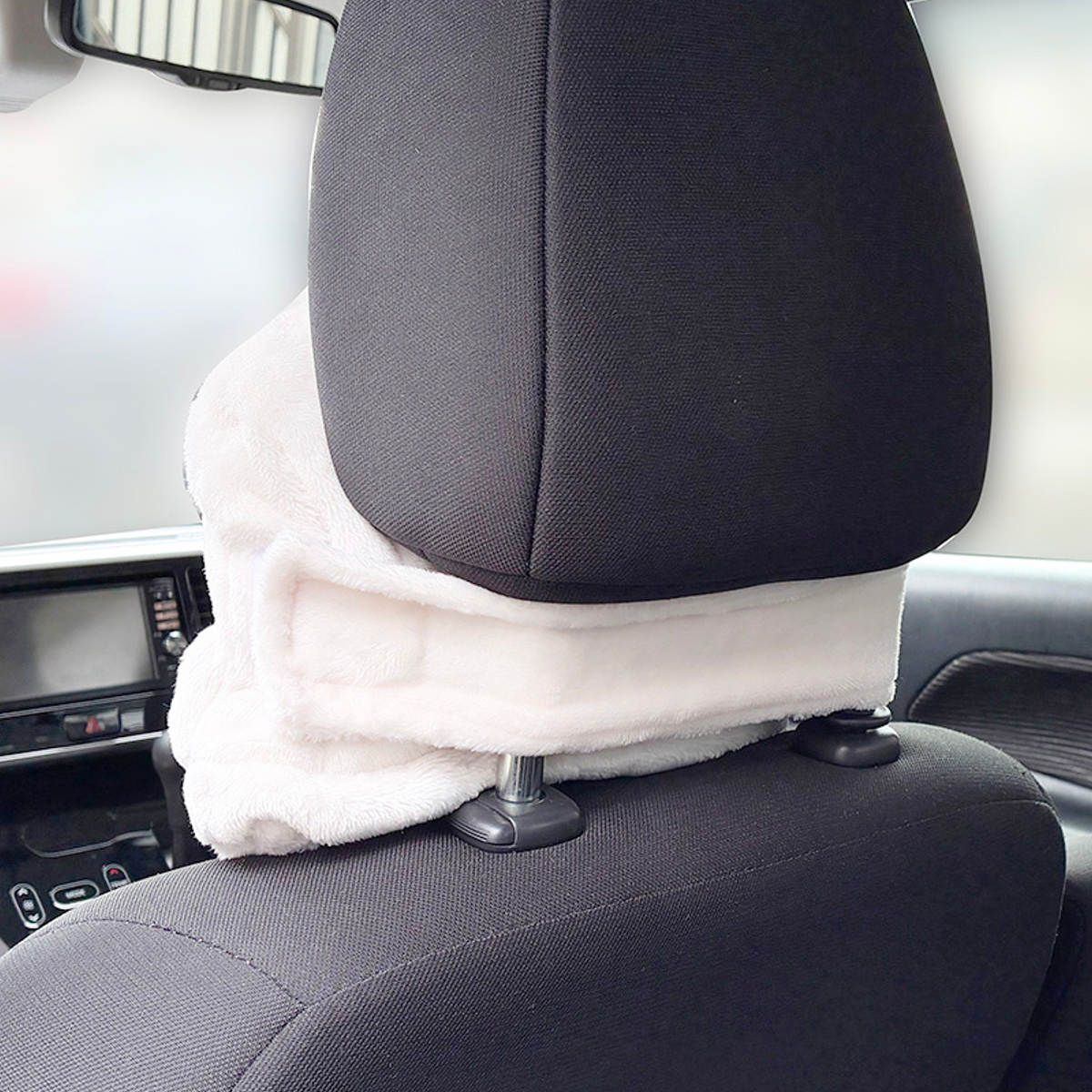 ●面ファスナー付きベルトでヘッドレストに固定し、取り外せばクッションにもなります。