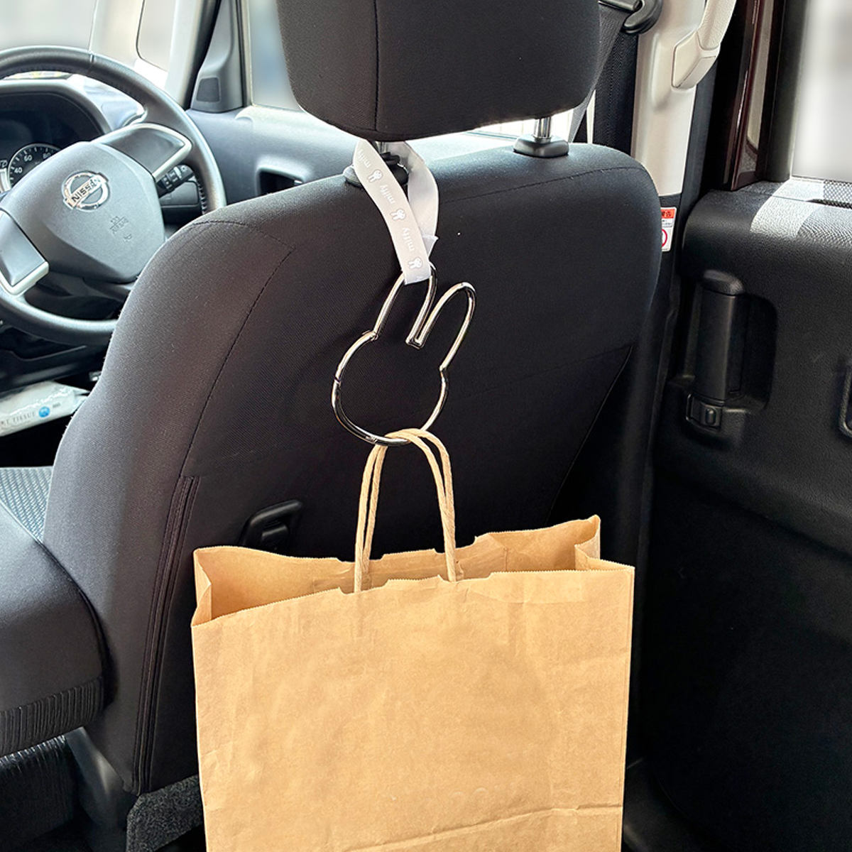 ●車のヘッドレストに取り付け、バッグや買い物袋をかけられるミッフィーシルエットのカラビナフックです。