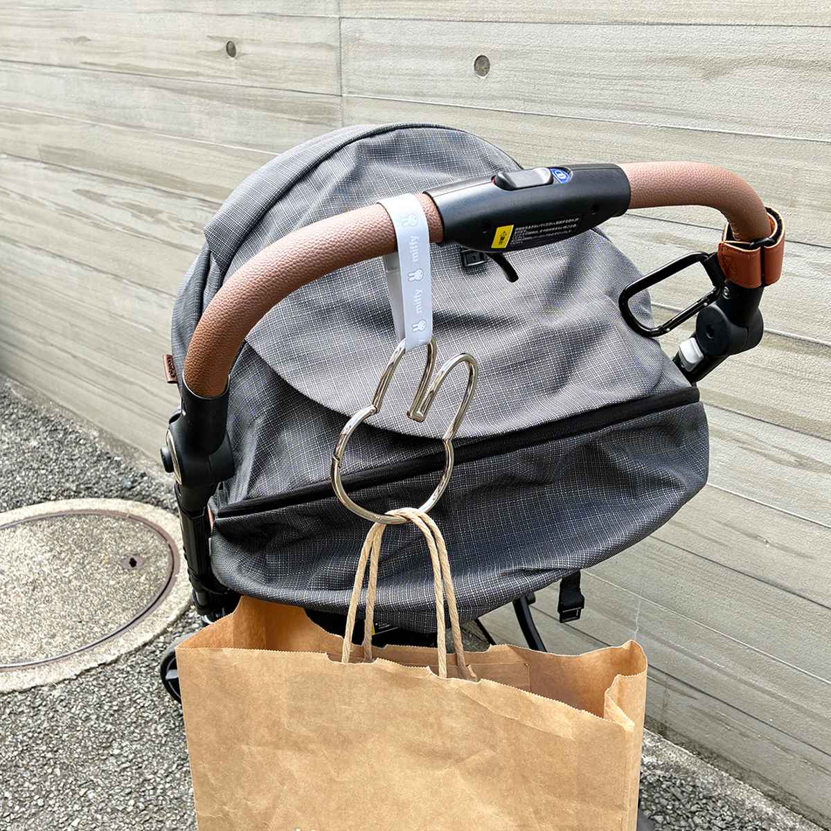 車だけでなく、ベビーカーに取り付けても便利にお使いいただけます。ちょっとした荷物やバッグを掛けておけば、手元がすっきりしてスマートにお出かけできます。