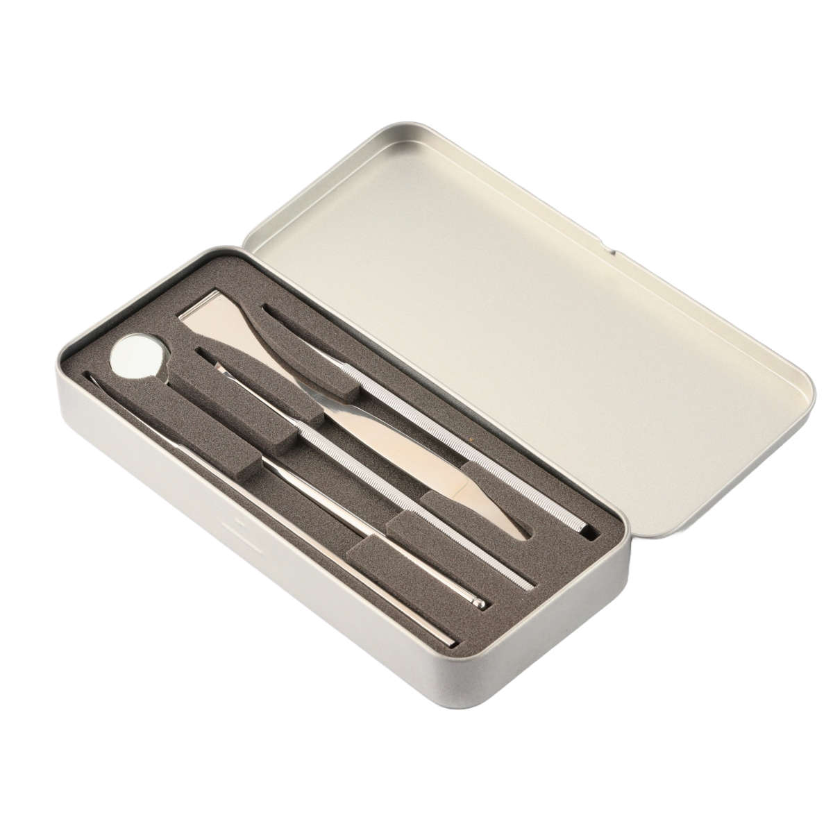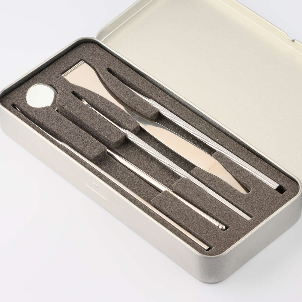 | 内容量 | ステンレスデンタルツール5本入り 歯垢除去ツール(先細、先太、先極細)、舌みがき、ミラー:各1本 Tin-Canケース入り |