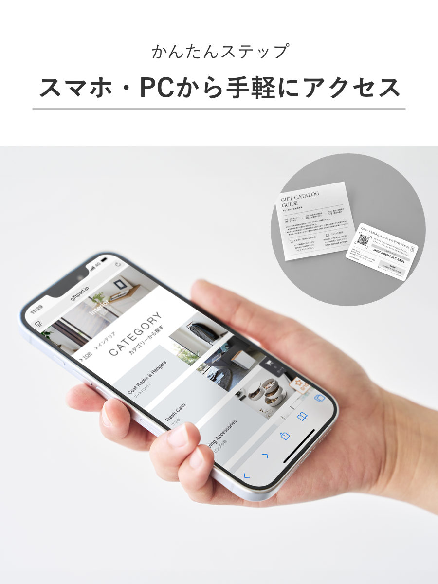 カード裏側のQRコードを読み取って専用サイトにログインするだけの簡単ステップで商品をお選びいただけます。ネットショッピング感覚で探しやすく、移動時間や空き時間に商品の申し込みが可能です。