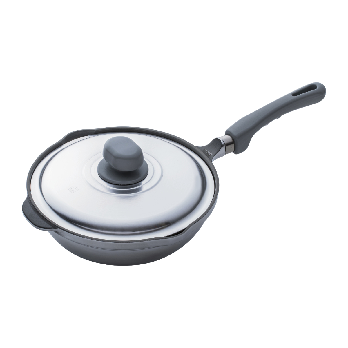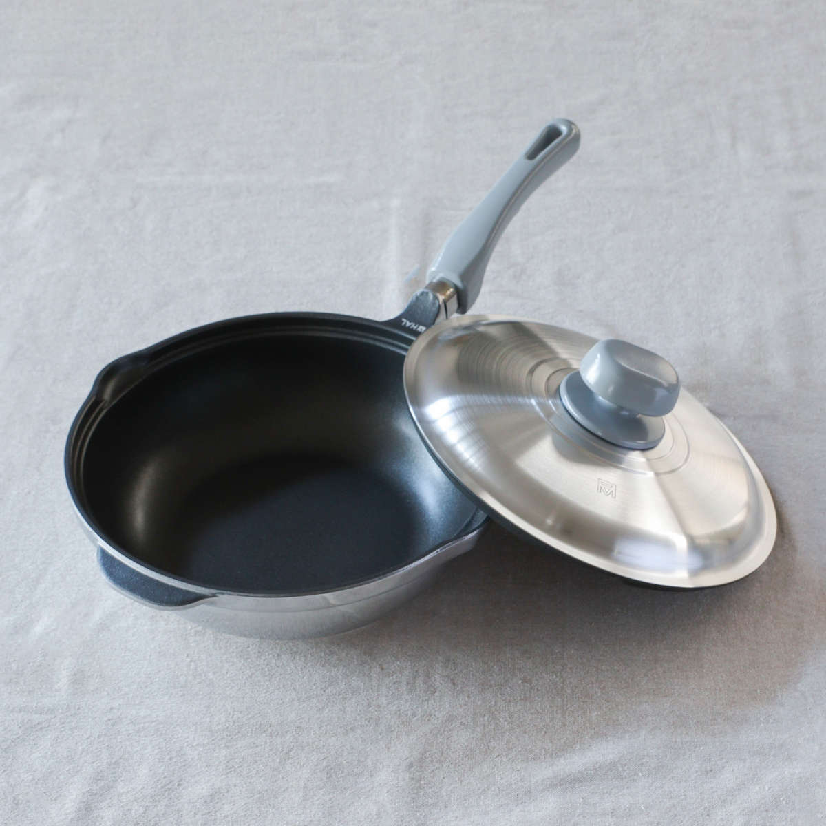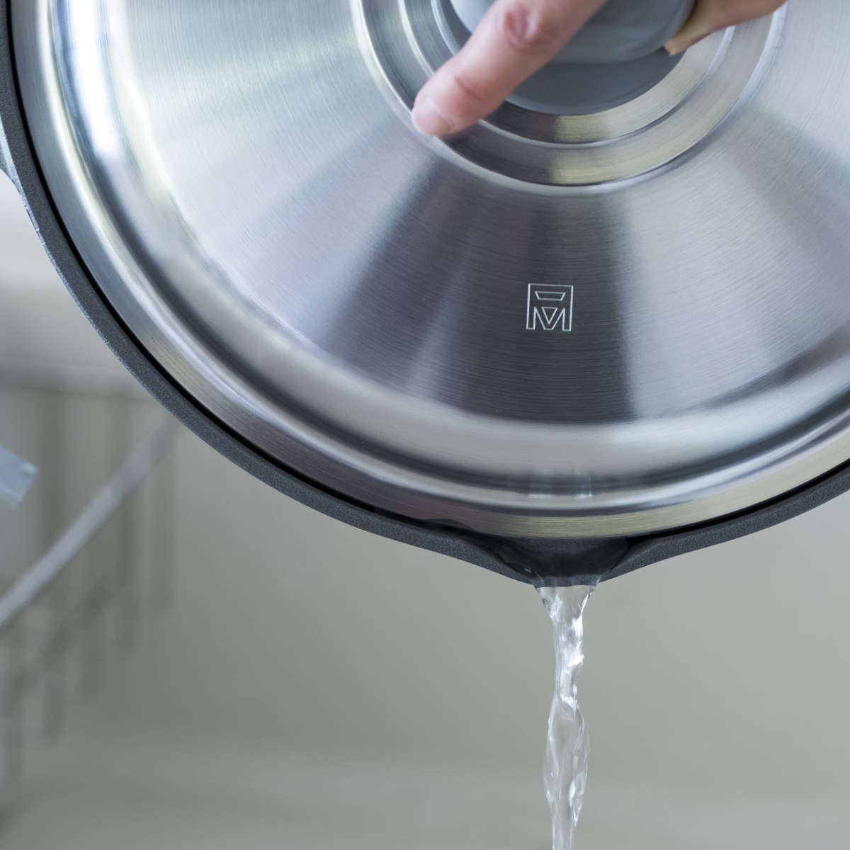 本体と同じ厚手のアルミニウム鋳物の蓋で鍋全体の熱効率を高めています。蓋の裏面までふっ素樹脂加工を施しているため汚れが付きにくくお手入れも簡単です。