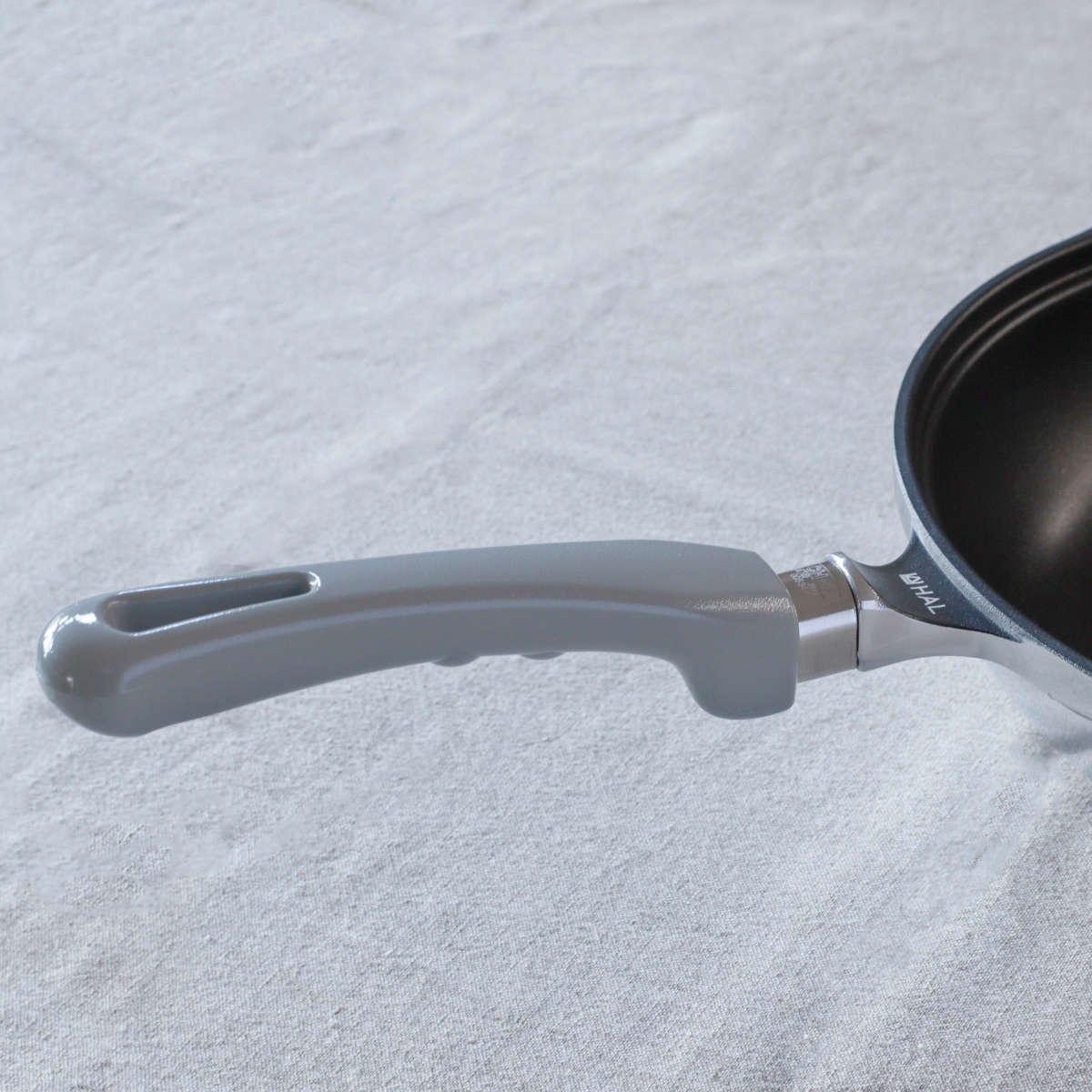 持ち手は丈夫な樹脂製です。ほどよいカーブを持たせることで、調理時や持ち運び時にも扱いやすいです。反対側には補助取っ手を備え、片手鍋の手軽さはそのままに、両手でも支えられます。