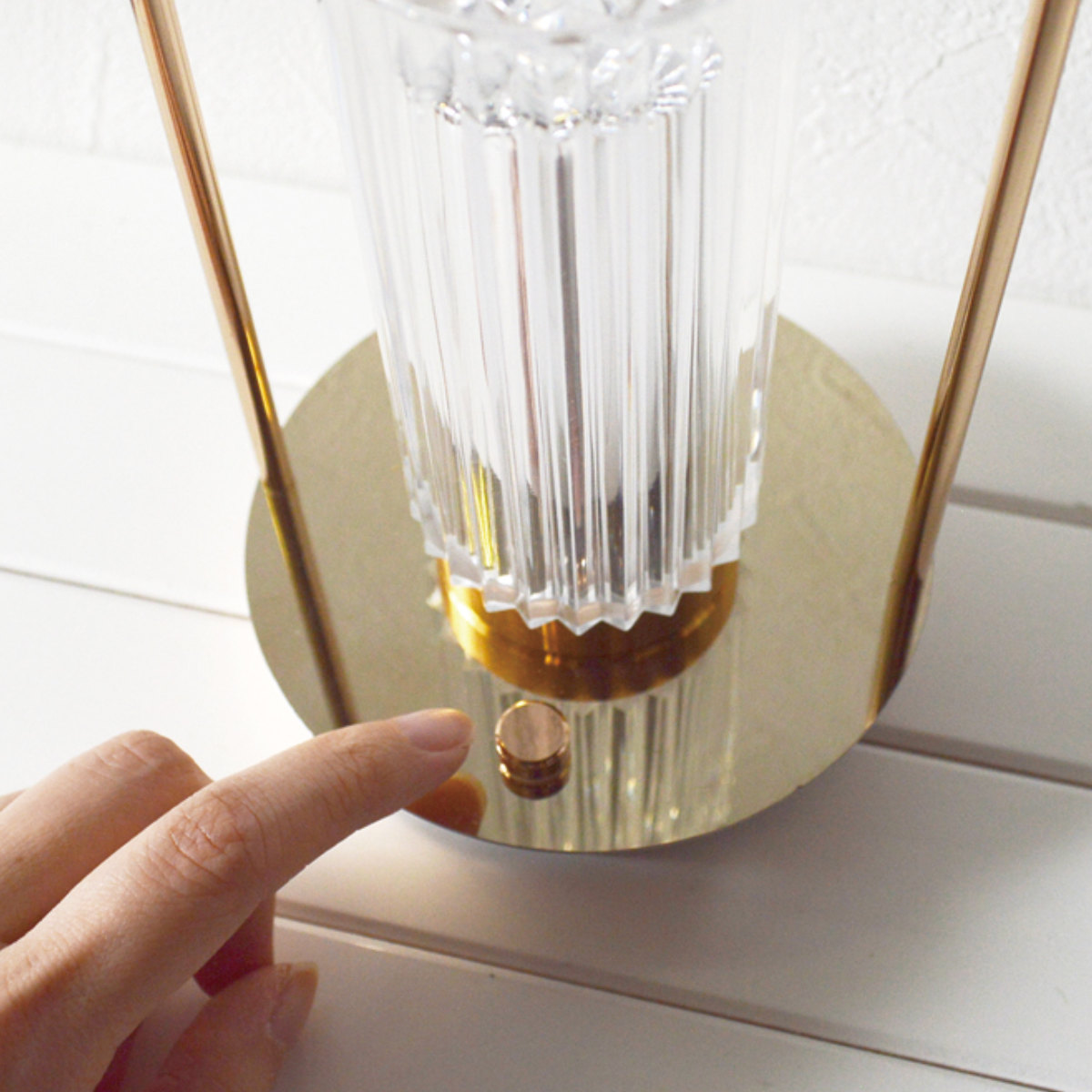 柔らかな光がガラスを通して広がる、LEDを内蔵したランタンです。繊細なカッティングガラスと真鍮風のベースが上品に調和し、韓国風のインテリアやシンプルにまとめたお部屋にもすっと溶け込みます。小ぶりながら存在感があり、置くだけで洗練された雰囲気を演出します。