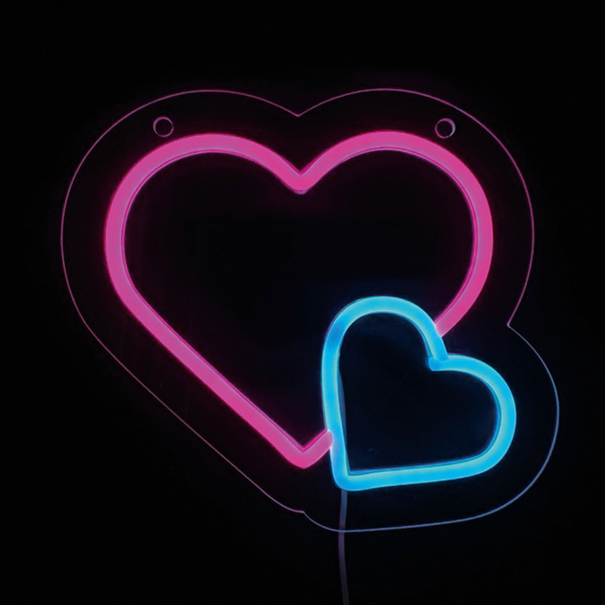 ネオニーサインライトの「ハート」デザインです。ビビッドなピンクとブルーの発色がインテリアを可愛らしく彩ります。