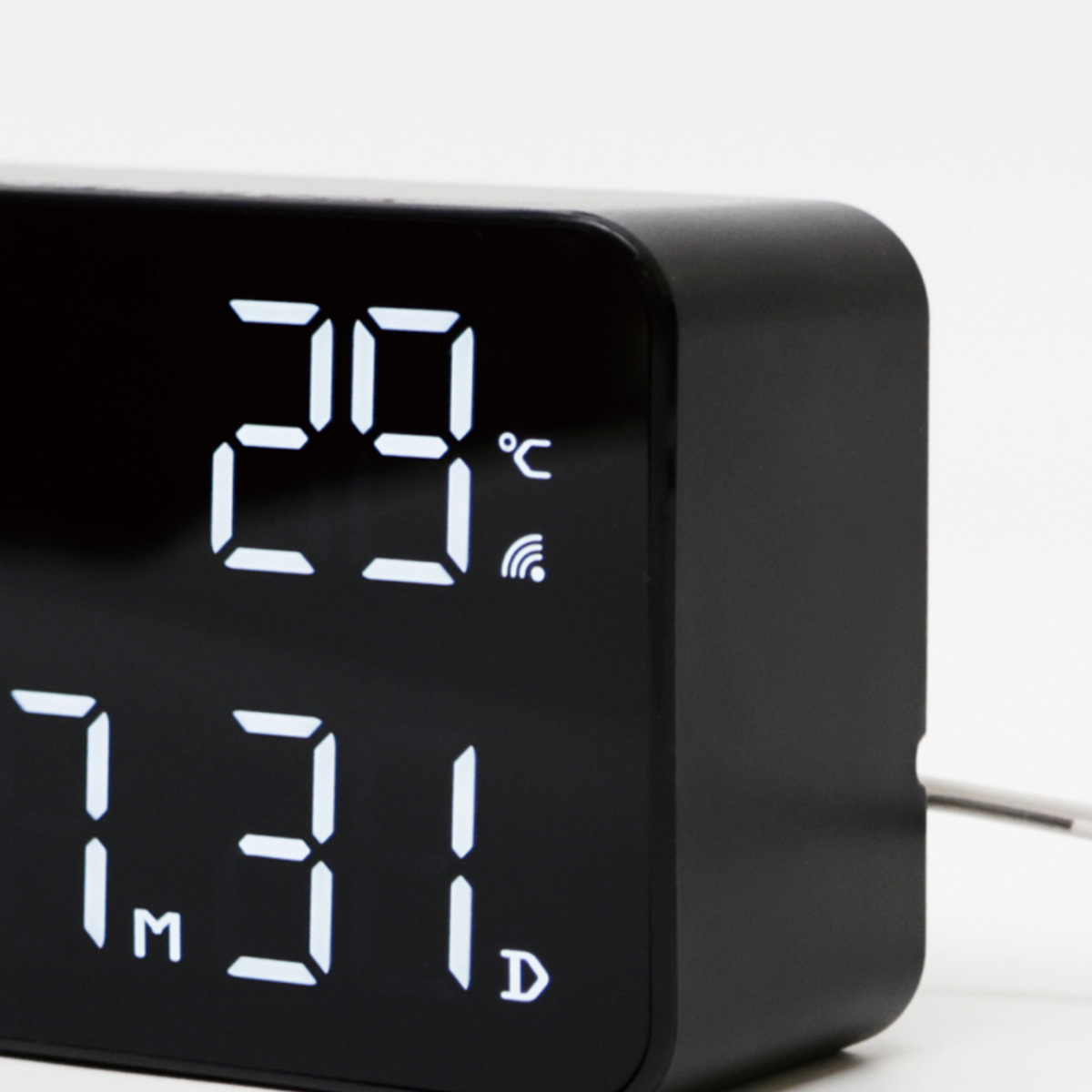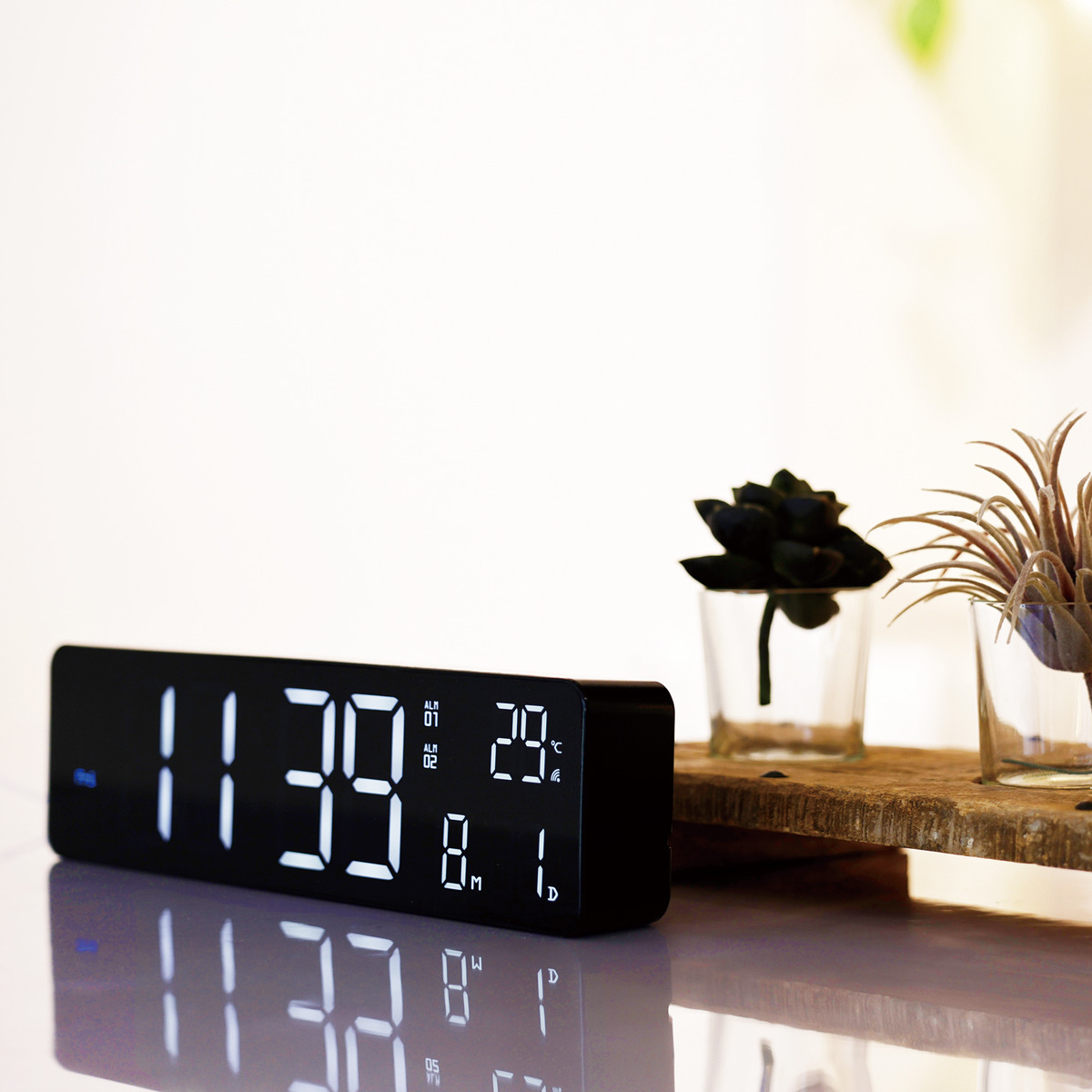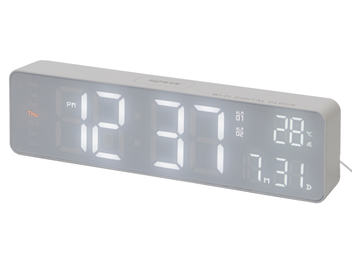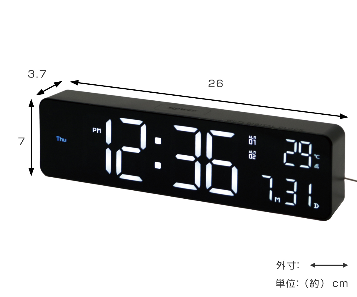 Wi-Fi接続で時刻やカレンダーを自動調整できる高機能なLED時計です。シンプルでコンパクトなデザインながら、時刻、日付、曜日、温度をひと目で確認できます。