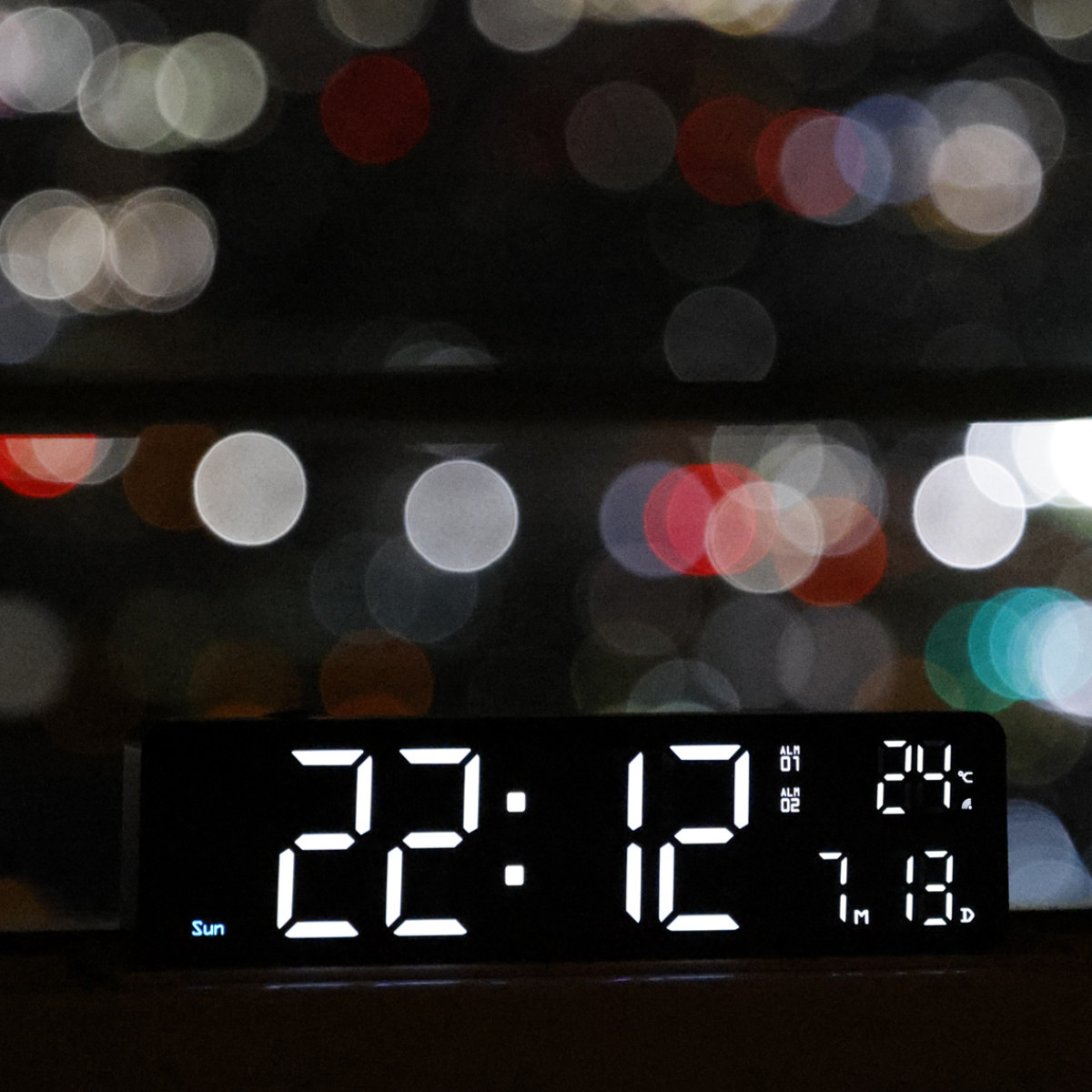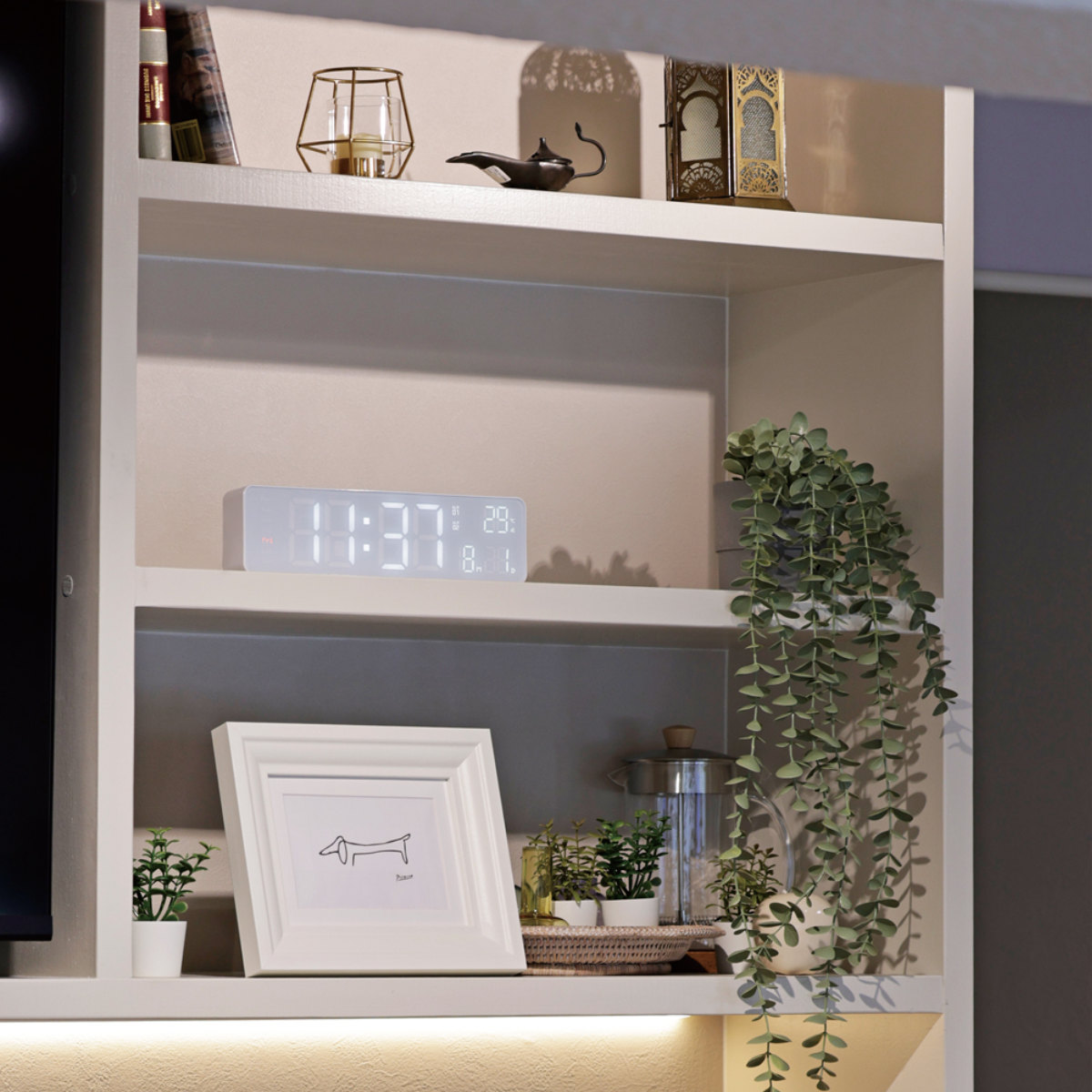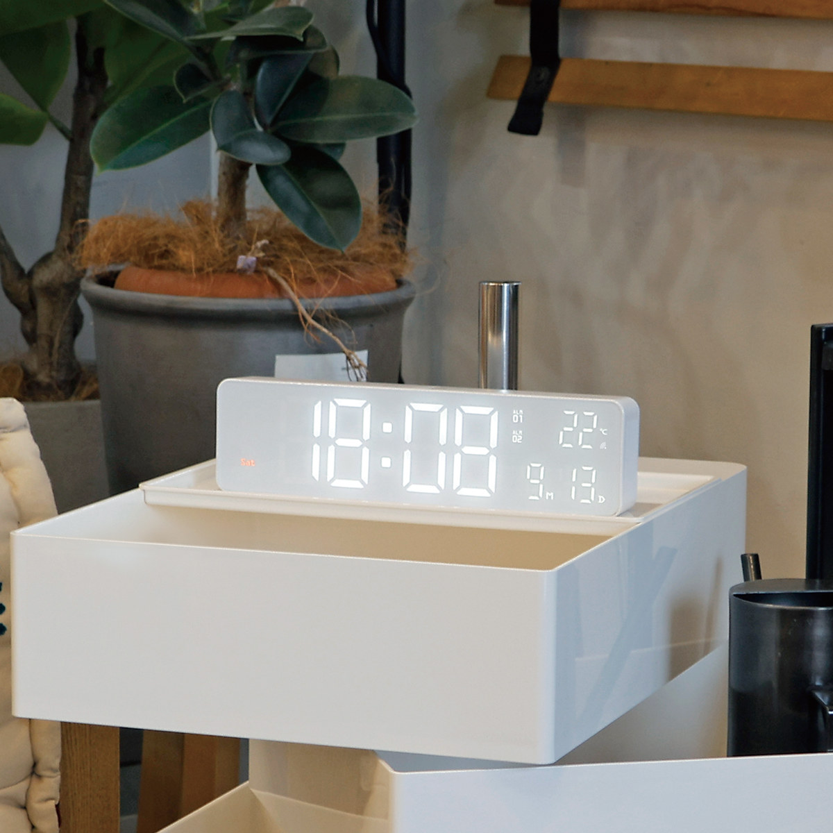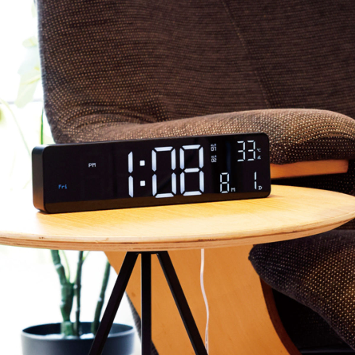 Wi-Fi接続で時刻やカレンダーを自動調整できる高機能なLED時計です。シンプルでコンパクトなデザインながら、時刻、日付、曜日、温度をひと目で確認できます。