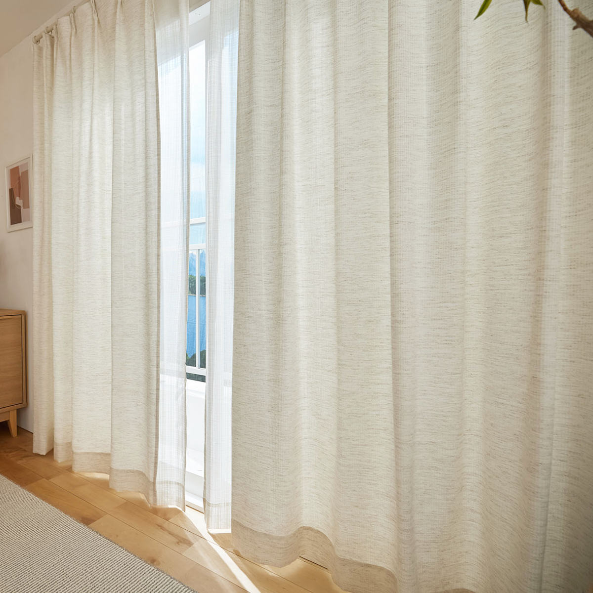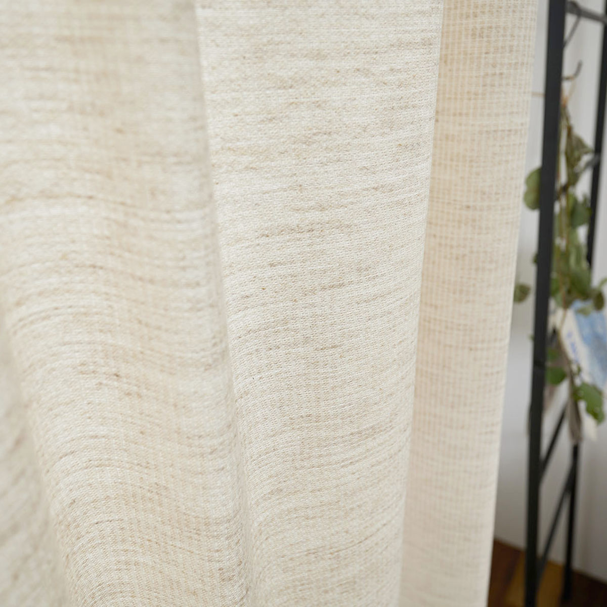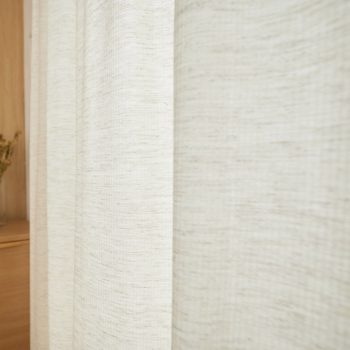 天然素材混の糸を用いて、ナチュラルな風合いに仕上げたドレープカーテンです。太陽の光を心地よく感じることができる生地感です。遮光なしカーテンならではの、ぬくもりをお楽しみください。