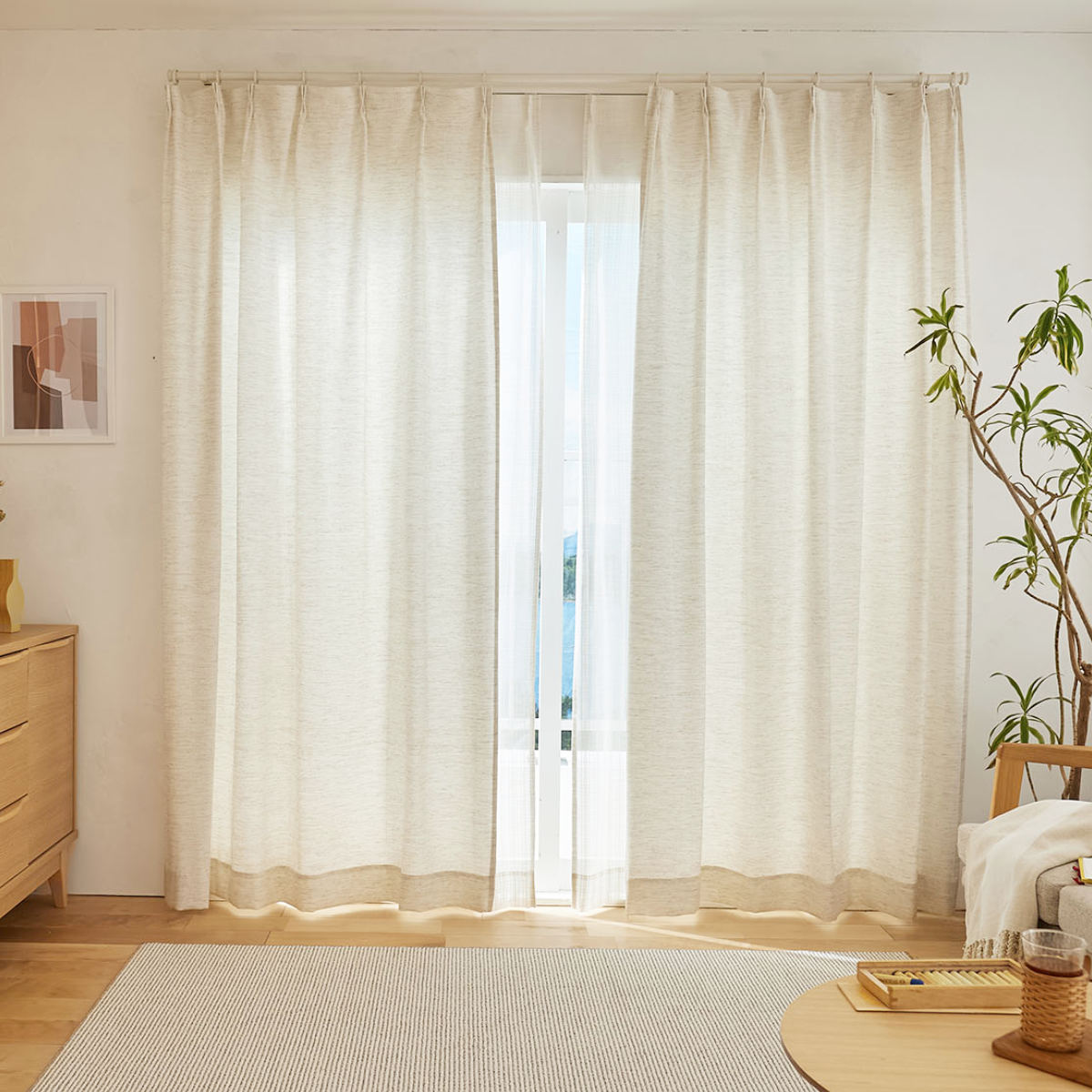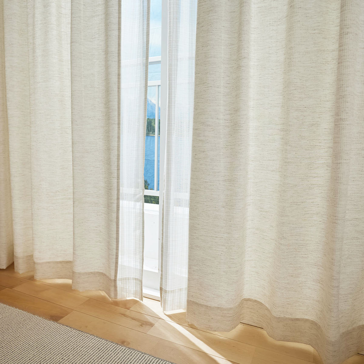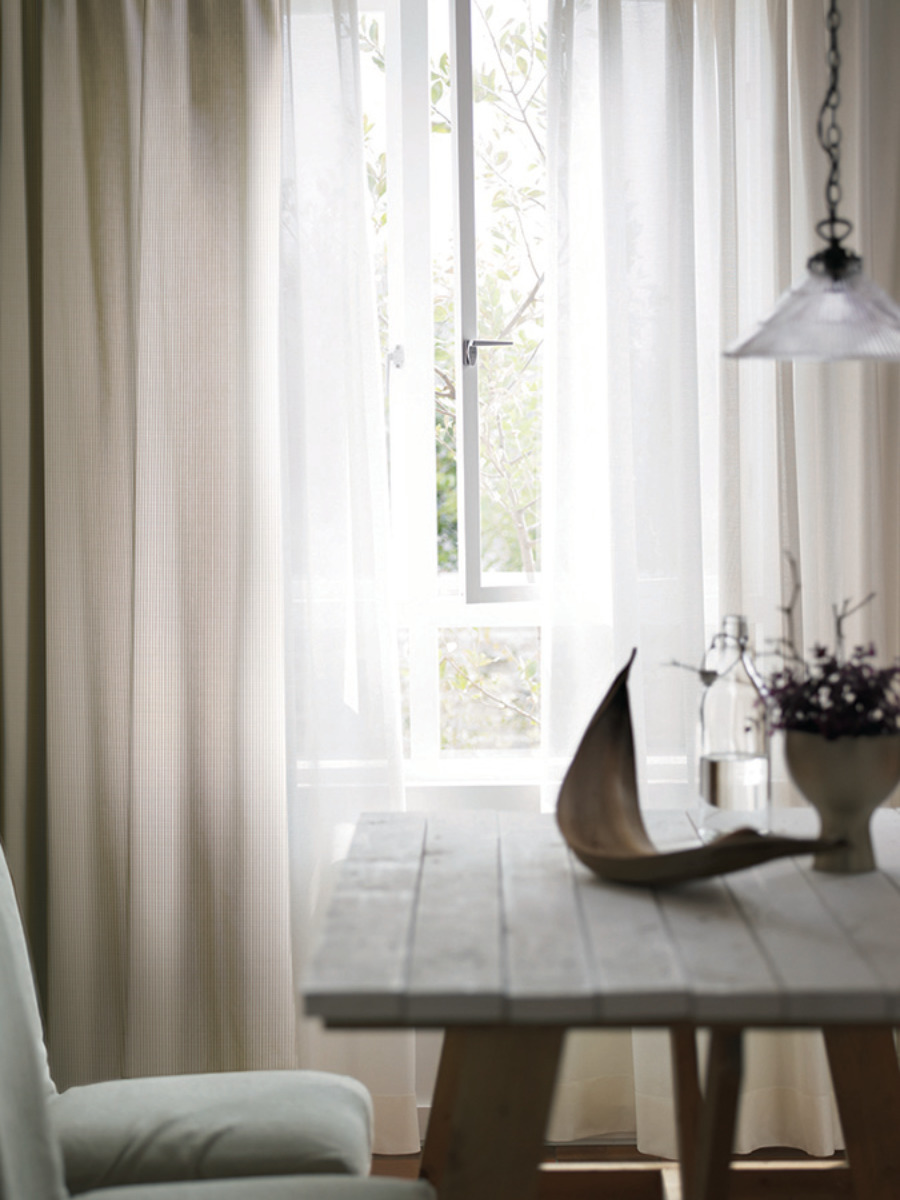 天然素材混の糸を用いて、ナチュラルな風合いに仕上げたドレープカーテンです。太陽の光を心地よく感じることができる生地感です。遮光なしカーテンならではの、ぬくもりをお楽しみください。