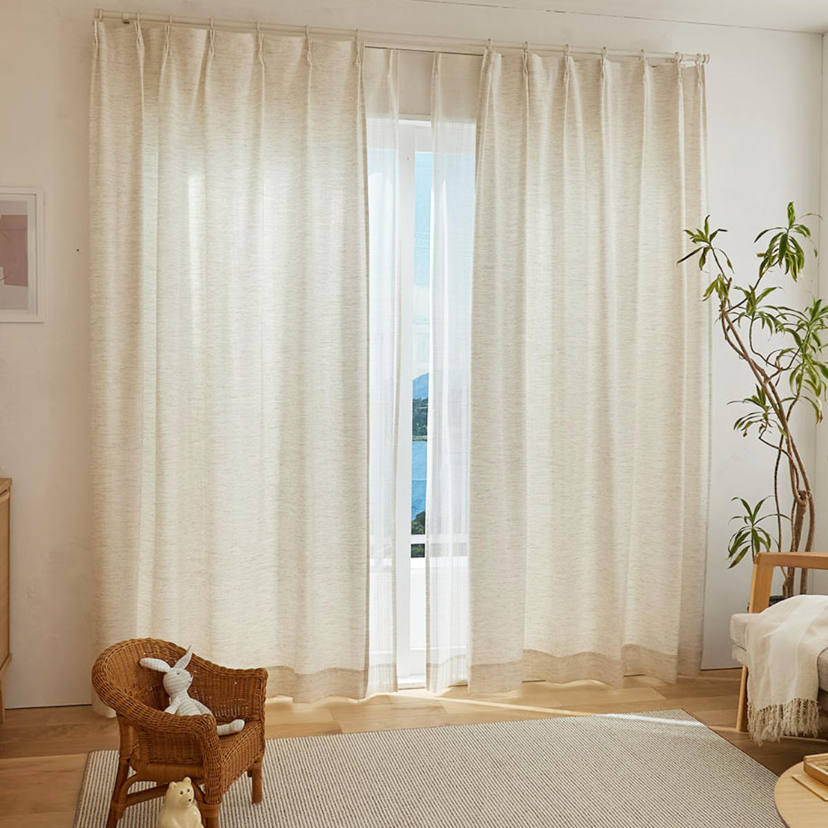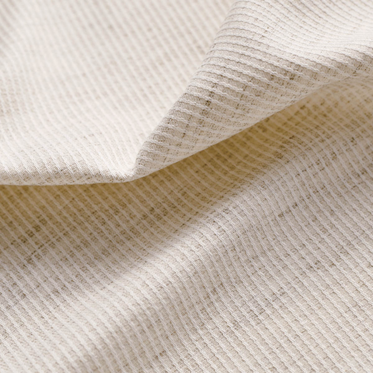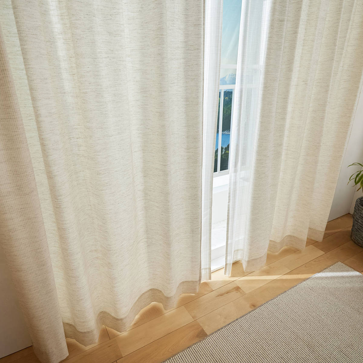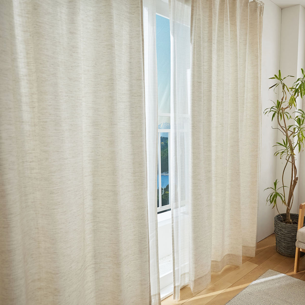 天然素材混の糸を用いて、ナチュラルな風合いに仕上げたドレープカーテンです。太陽の光を心地よく感じることができる生地感です。遮光なしカーテンならではの、ぬくもりをお楽しみください。