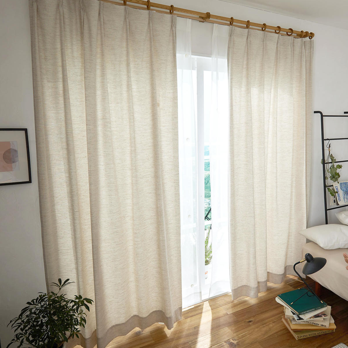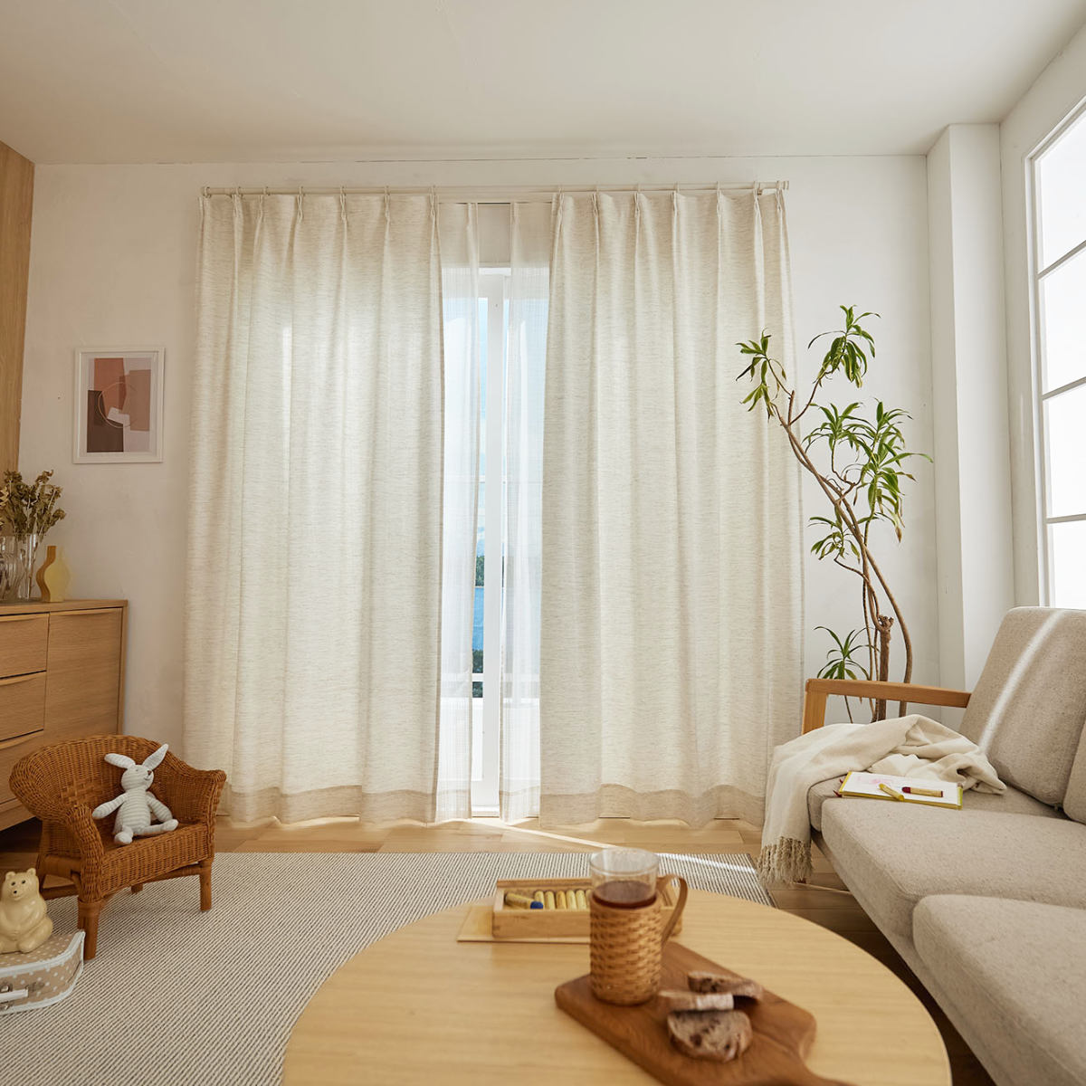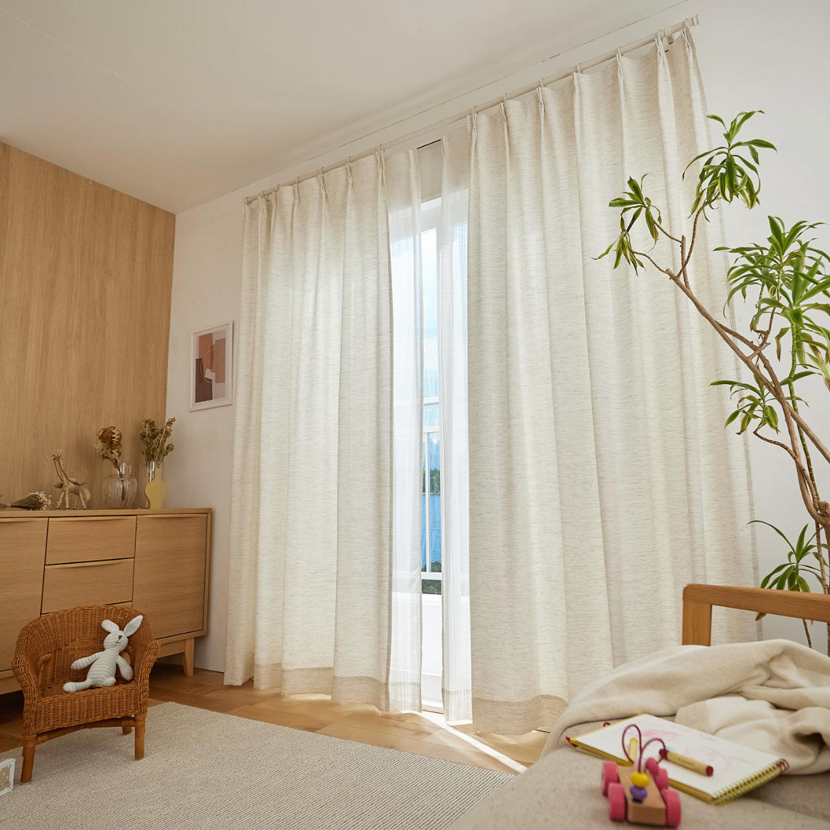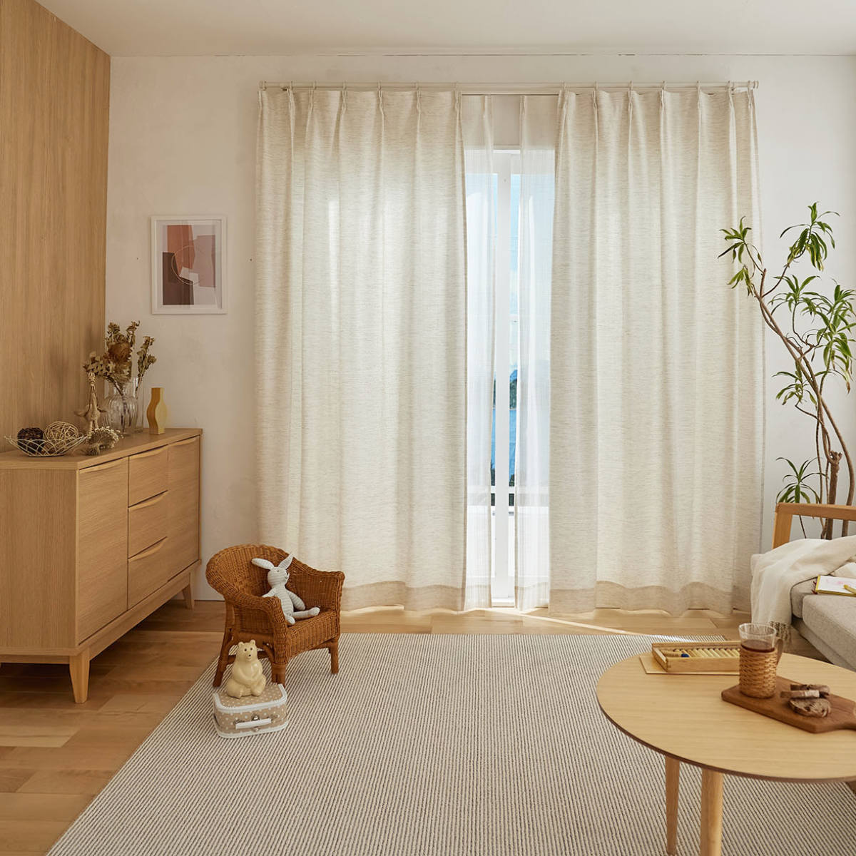 天然素材混の糸を用いて、ナチュラルな風合いに仕上げたドレープカーテンです。太陽の光を心地よく感じることができる生地感です。遮光なしカーテンならではの、ぬくもりをお楽しみください。