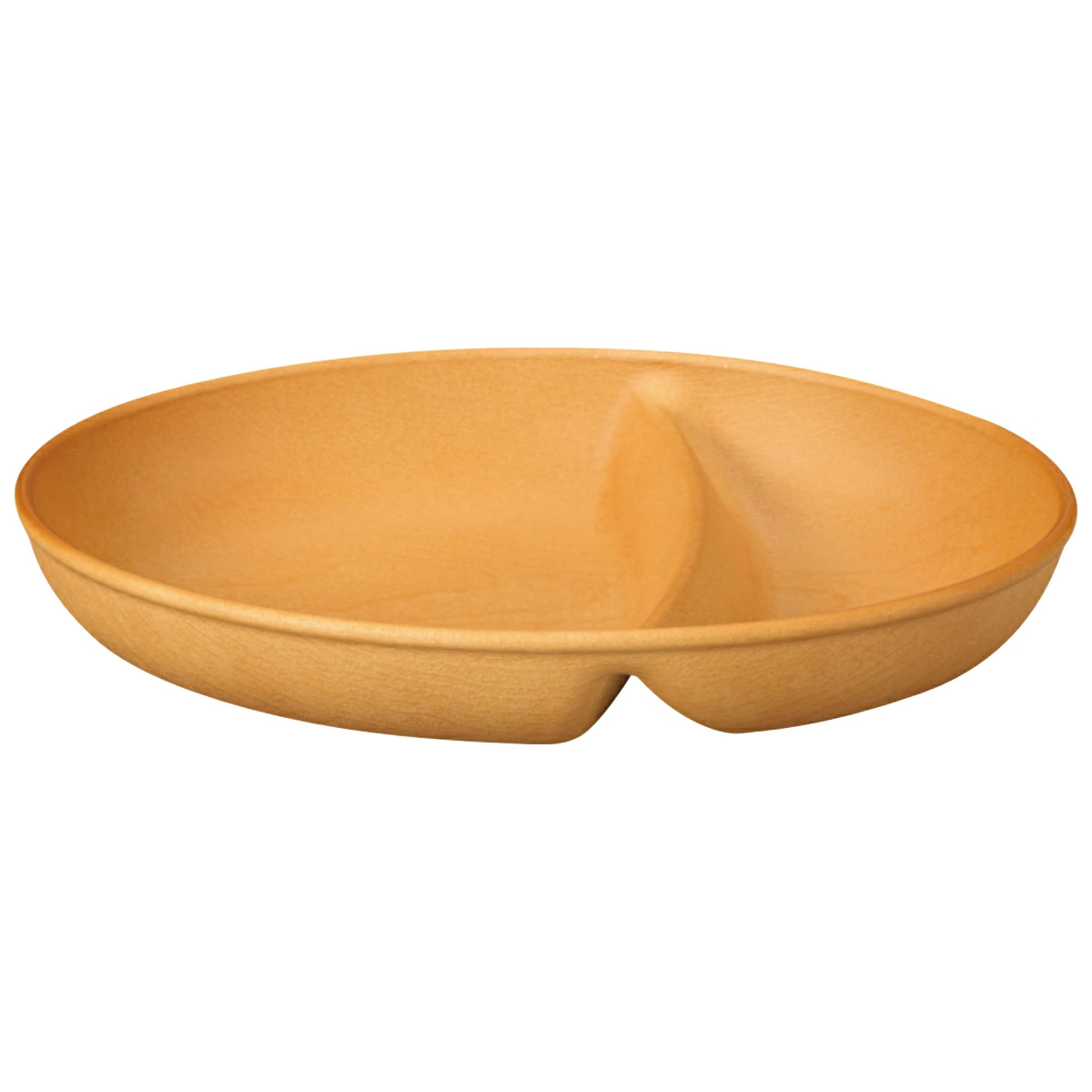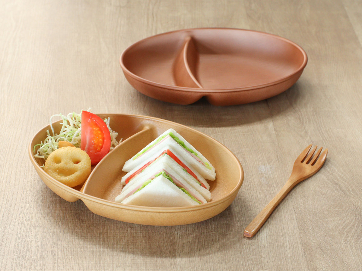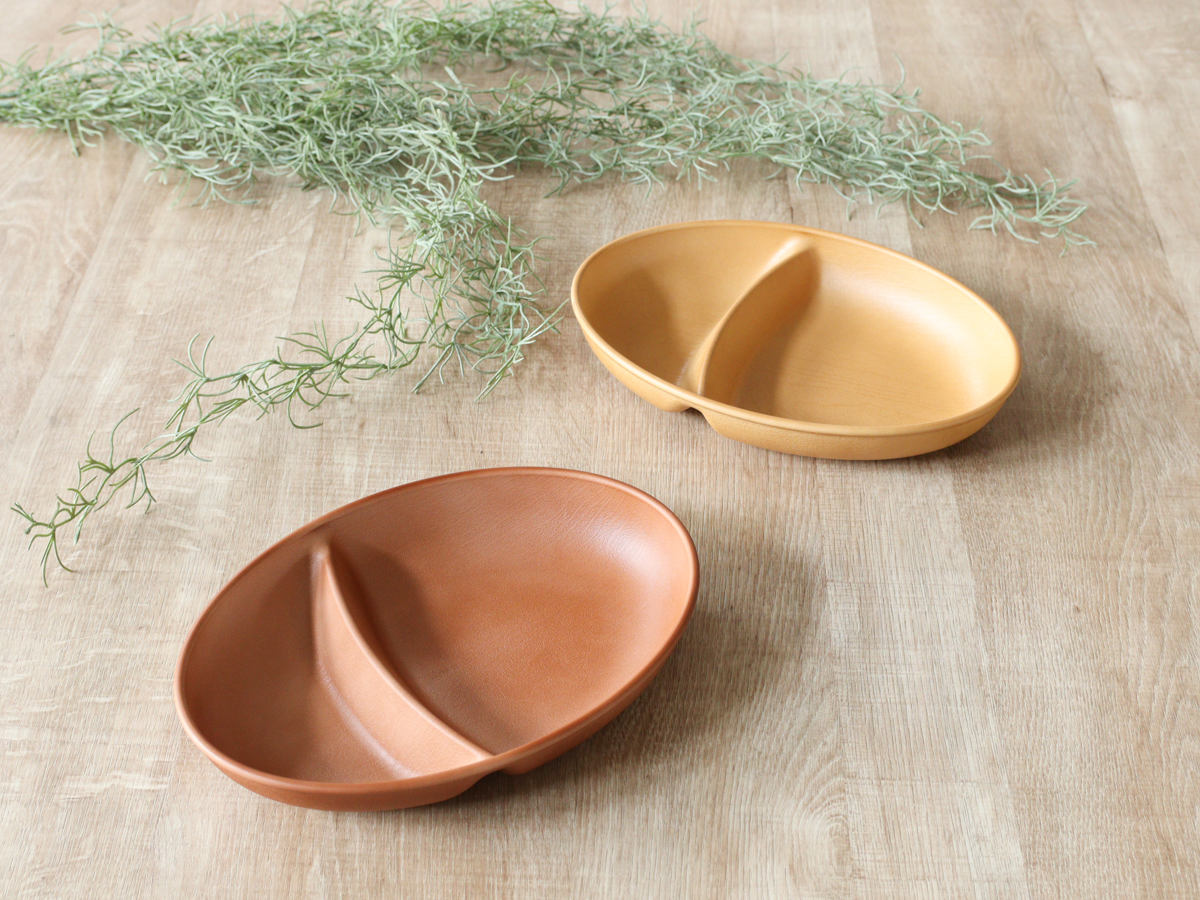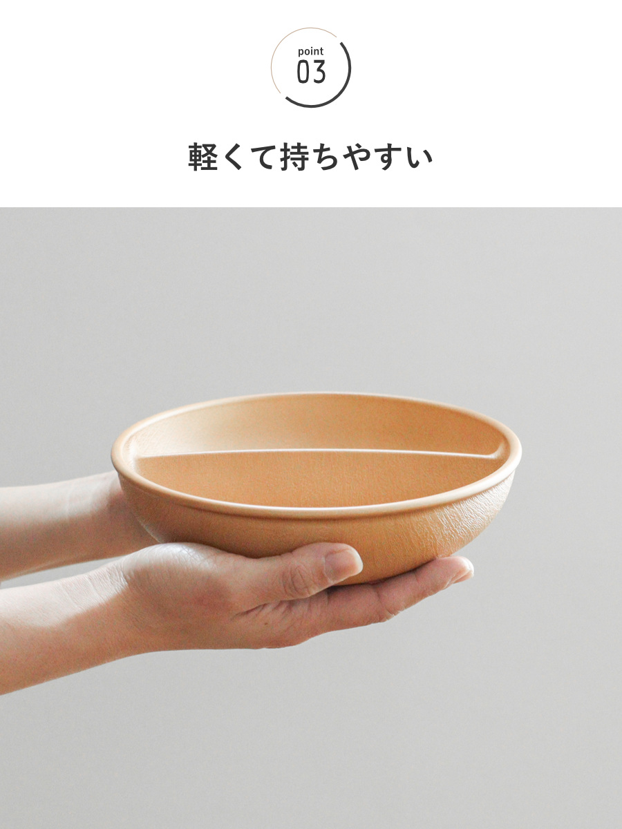 樹脂製で軽くて割れにくい耐久性のあるボウルです。2つの仕切りがあるオーバル型のボウルで、少し深さがあり、汁気のものも混ざらず盛り付けができます。カレーとサラダなどを一緒に盛り付けてワンプレートで食事が楽しめます。