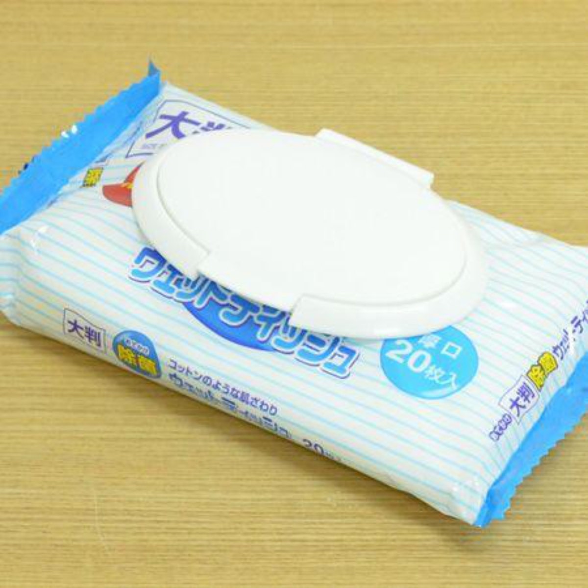 ●市販の携帯用、詰め替え用ウェットシートの袋の口に取り付けて、シートを乾きにくくします。