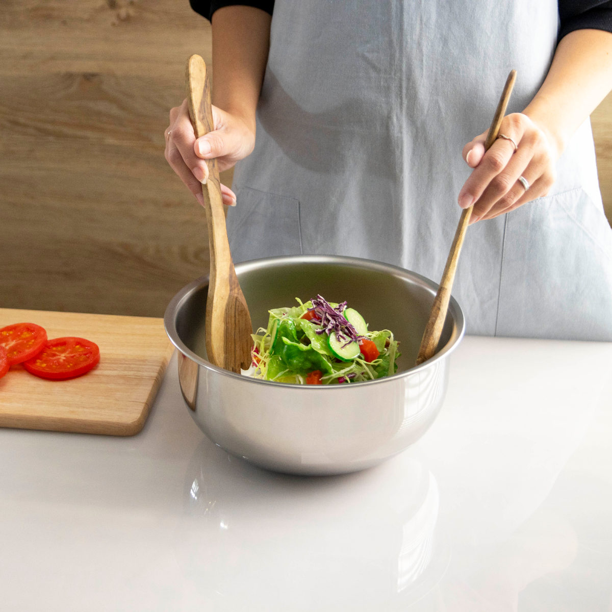 シンプルで使いやすいステンレス製サラダミックスボウルです。サラダを混ぜ合わせたり、生地やミンチをこねるのに使いやすいサイズです。