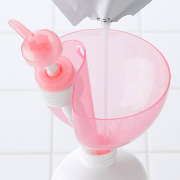 | ポンプ式のボトルの詰め替えに重宝! くぼみがあり、ポンプをはめたまま詰め替えができますので、ポンプ式のボトルの詰め替えに重宝します。市販のシャンプー・リンス・ボディソープ等、ほぼ全てのポンプ式ボトル(口内径2.3cm以上)に対応しています。 | ||