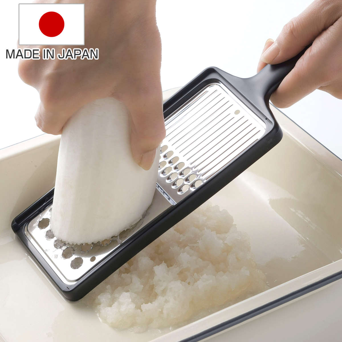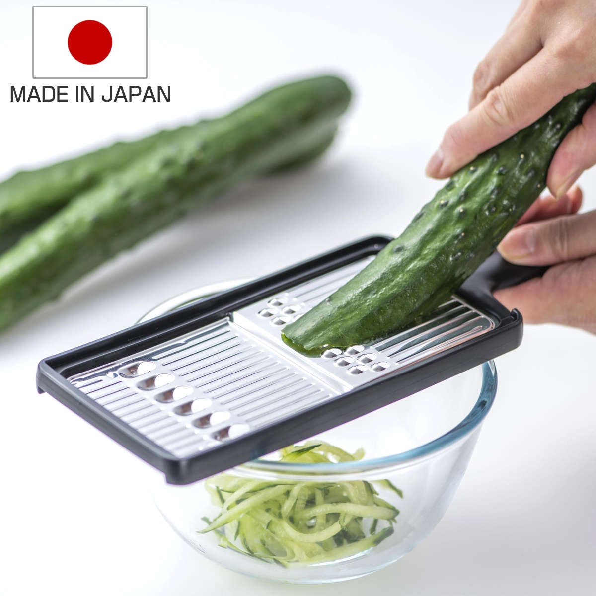 ブラックの枠色で落ちつきのある和のイメージのスライサーは、丈夫で衛生的なステンレス製の刃を使用しています。サラダやおみそ汁の具に便利です。包丁よりも手軽に素早くプロのような仕上がりになります。