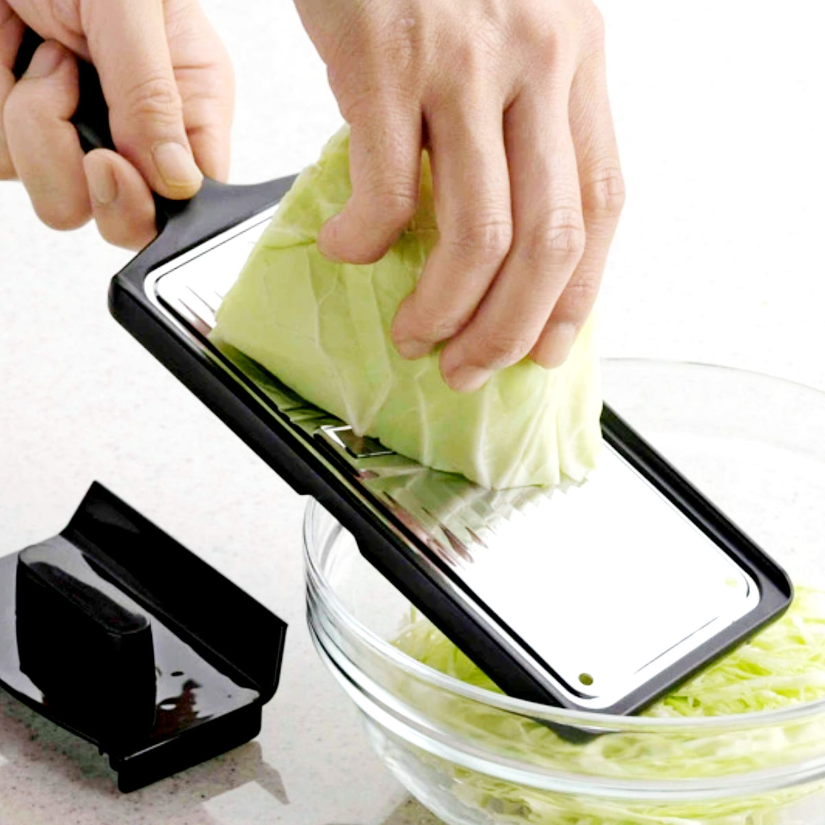 調理時と収納時に安全なガード付きです。小さくなった野菜や滑りやすい野菜の調理時も、最後まで安心してスライスできます。