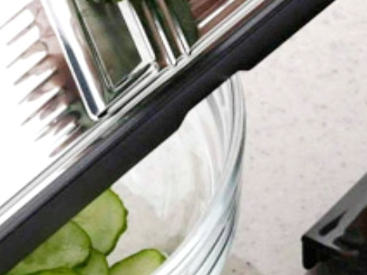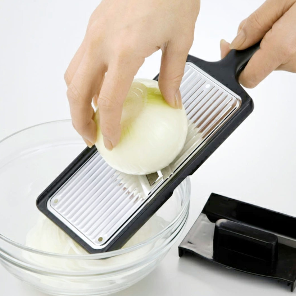 本体の凹み部分をボウルに引っかけることで、すべらず安定してスライスできます。