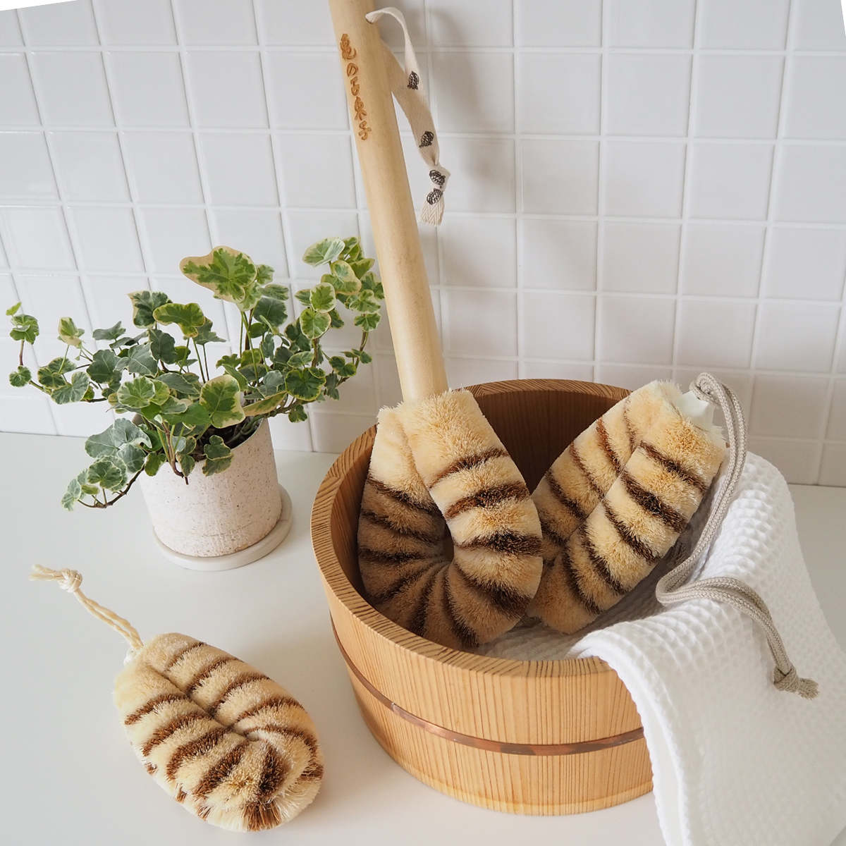 サイザル麻とココナッツ繊維の柔らかい部分を組み合わせた、ほどよい刺激と心地よい使用感が特徴的なボディケアたわしです。使うたびにリフレッシュできるような爽快な使い心地をお楽しみいただけます。ナチュラルな縞模様がどこか愛らしく、見た目にも癒されます。