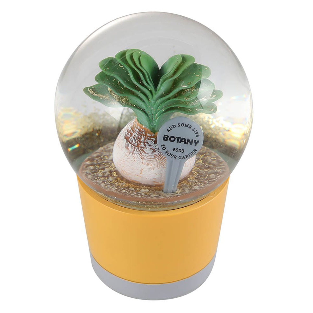 ころんとしたガラスドームの中に、個性的なフォルムが魅力の多肉植物「ブーファン」のオブジェを閉じ込めた、スノードーム風のインテリアオブジェです。まるで小さな植物の世界をそのまま切り取ったようなデザインで、置くだけで空間に遊び心のあるアクセントを添えてくれます。