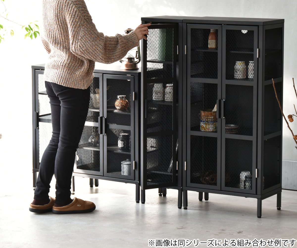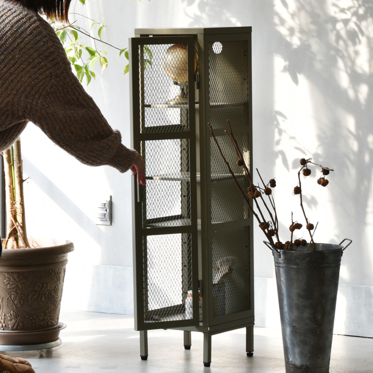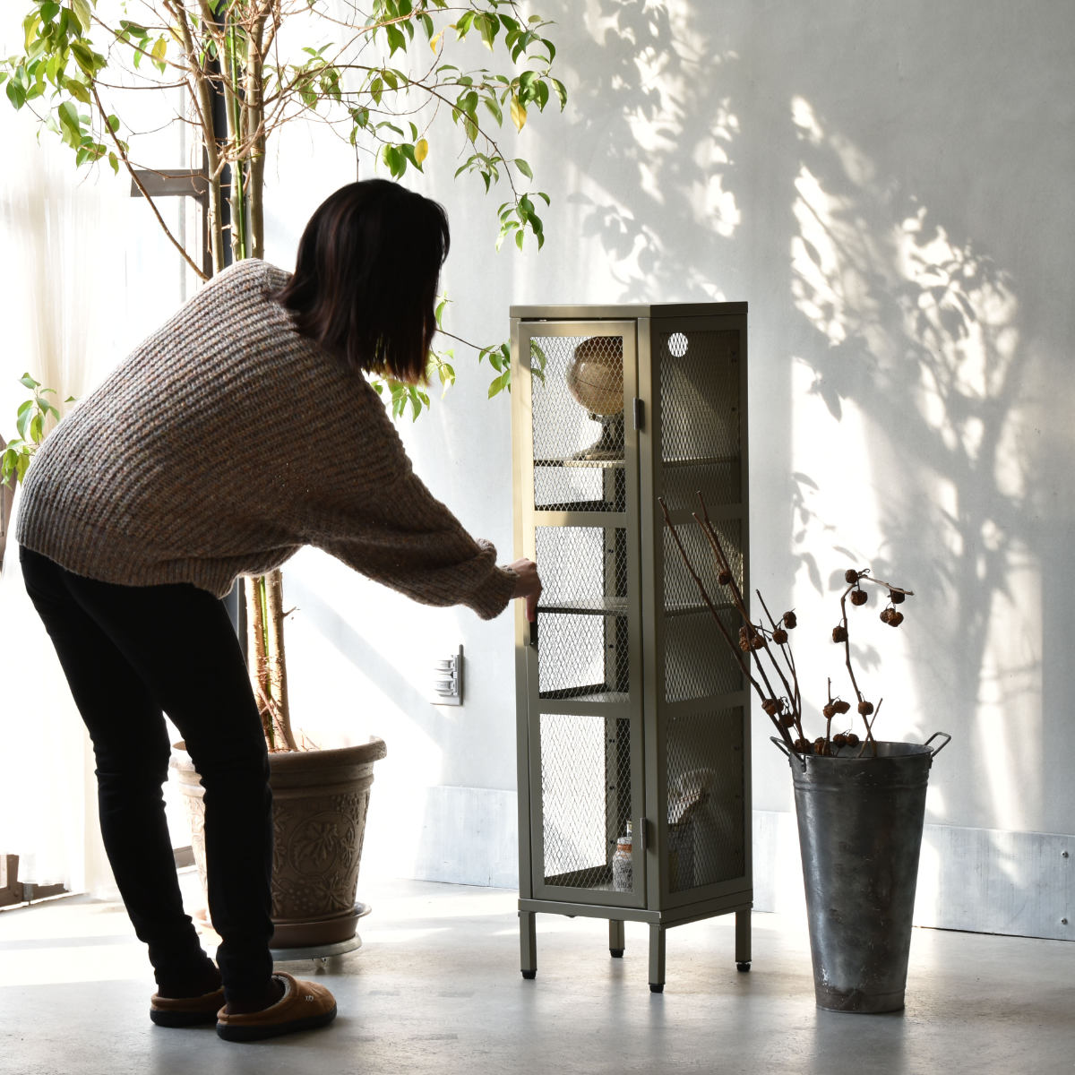 アメリカンヴィンテージをベースにした、洗練されたメッシュキャビネット。スチール×メッシュが生む抜け感が魅力の「見せる収納」です。