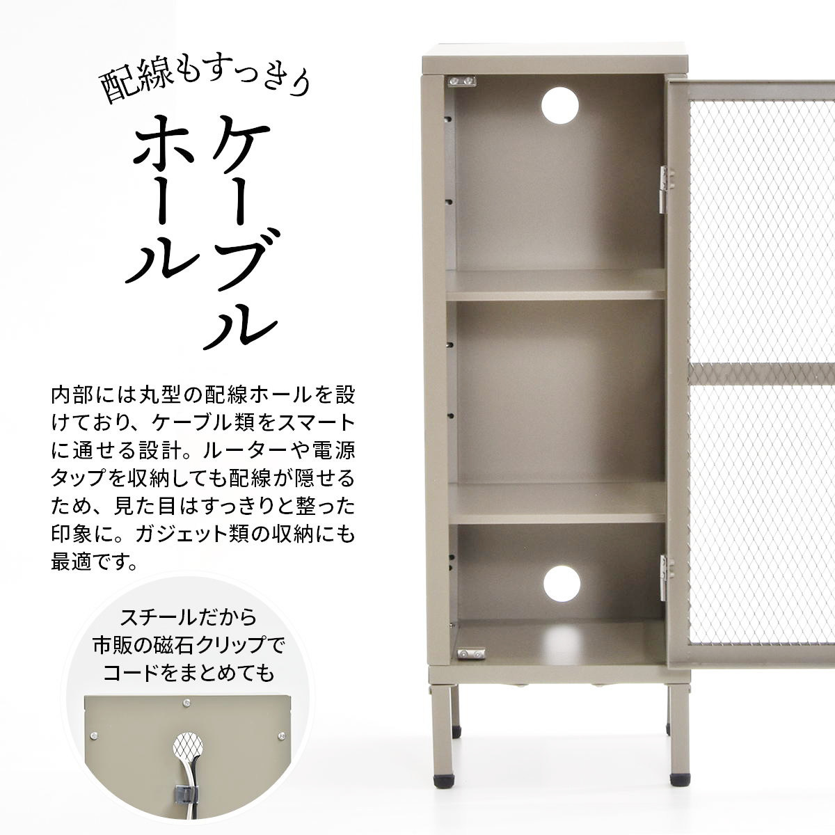 内部には丸型の配線ホールがあり、ケーブルを整理しながら収納可能です。スチール製なので、市販の磁石クリップでコードをまとめられます。