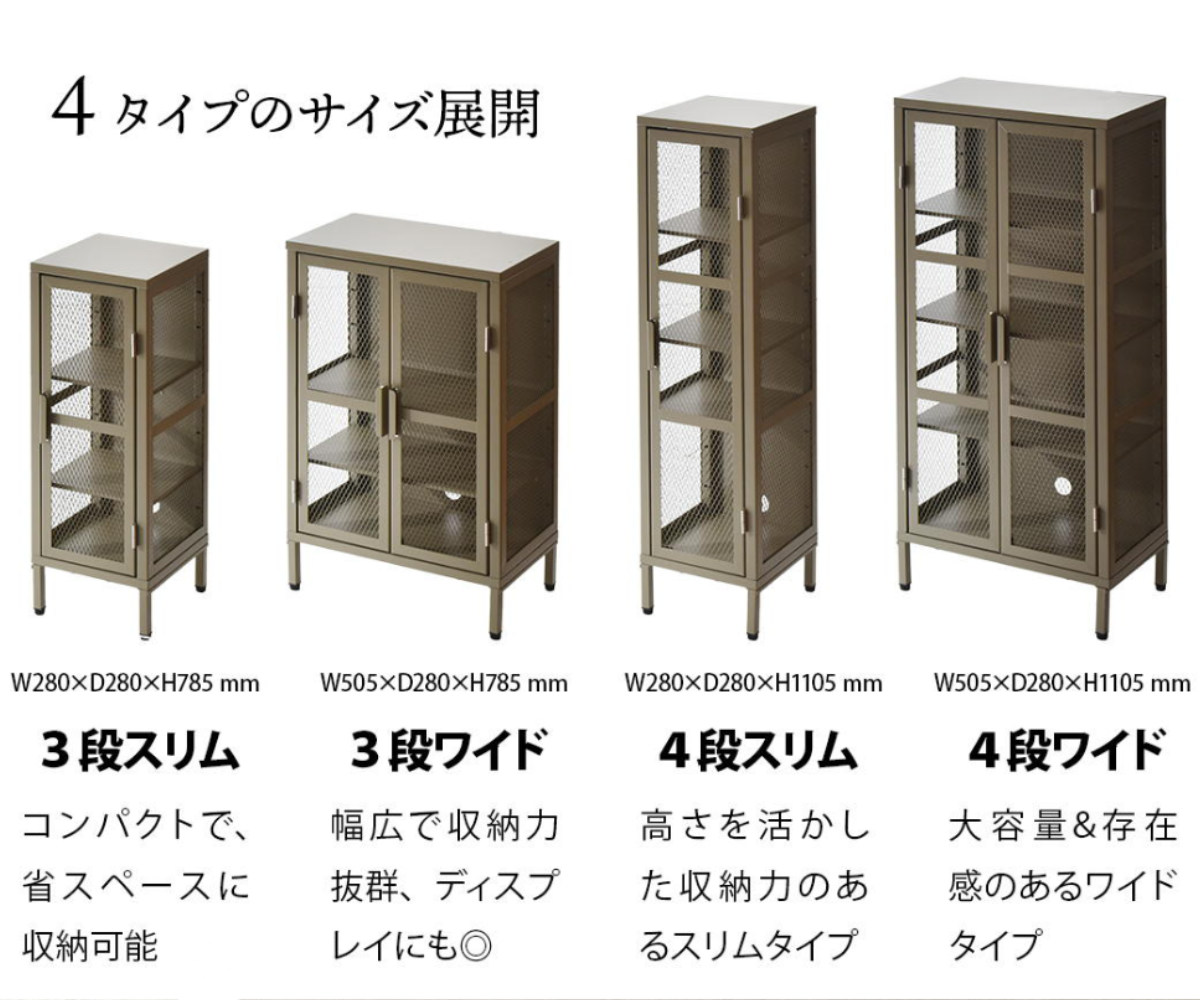 ![]() スリムメッシュキャビネット 3段 | ![]() スリムメッシュキャビネット 4段 【▲このページの商品】 | ![]() ワイドメッシュキャビネット 3段 |