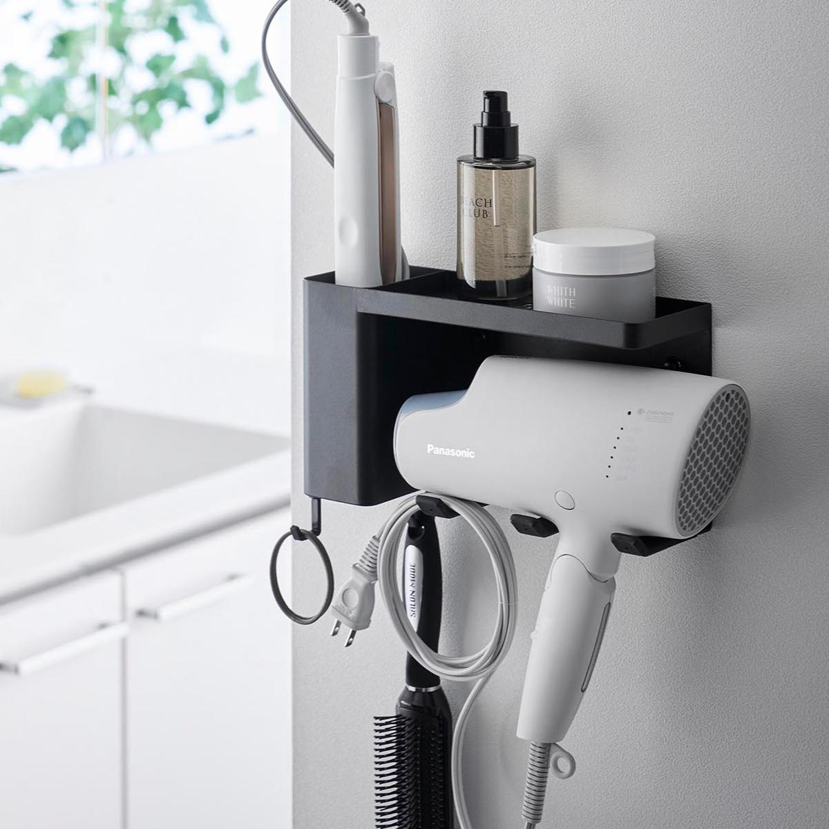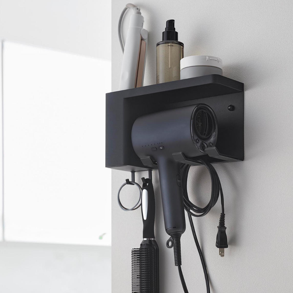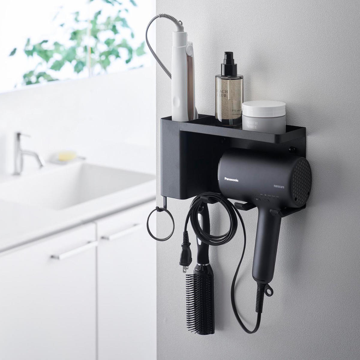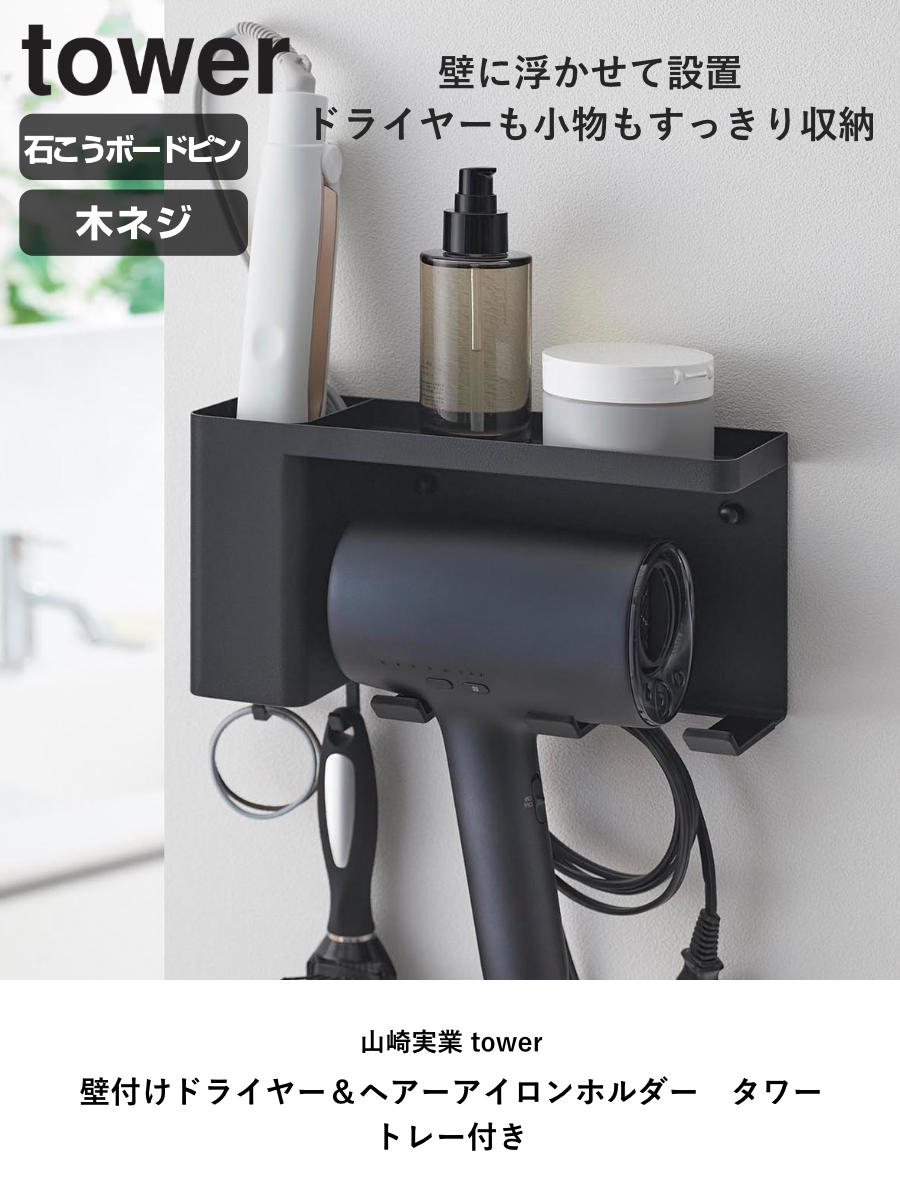 山崎実業 tower 壁付けドライヤー&ヘアーアイロンホルダー タワー トレー付き ( 4903208102544 タワーシリーズ ドライヤーホルダー 洗面所 ヘアーアイロンホルダー 壁付け 壁面収納 小物置き トレー ) 【ブラック】