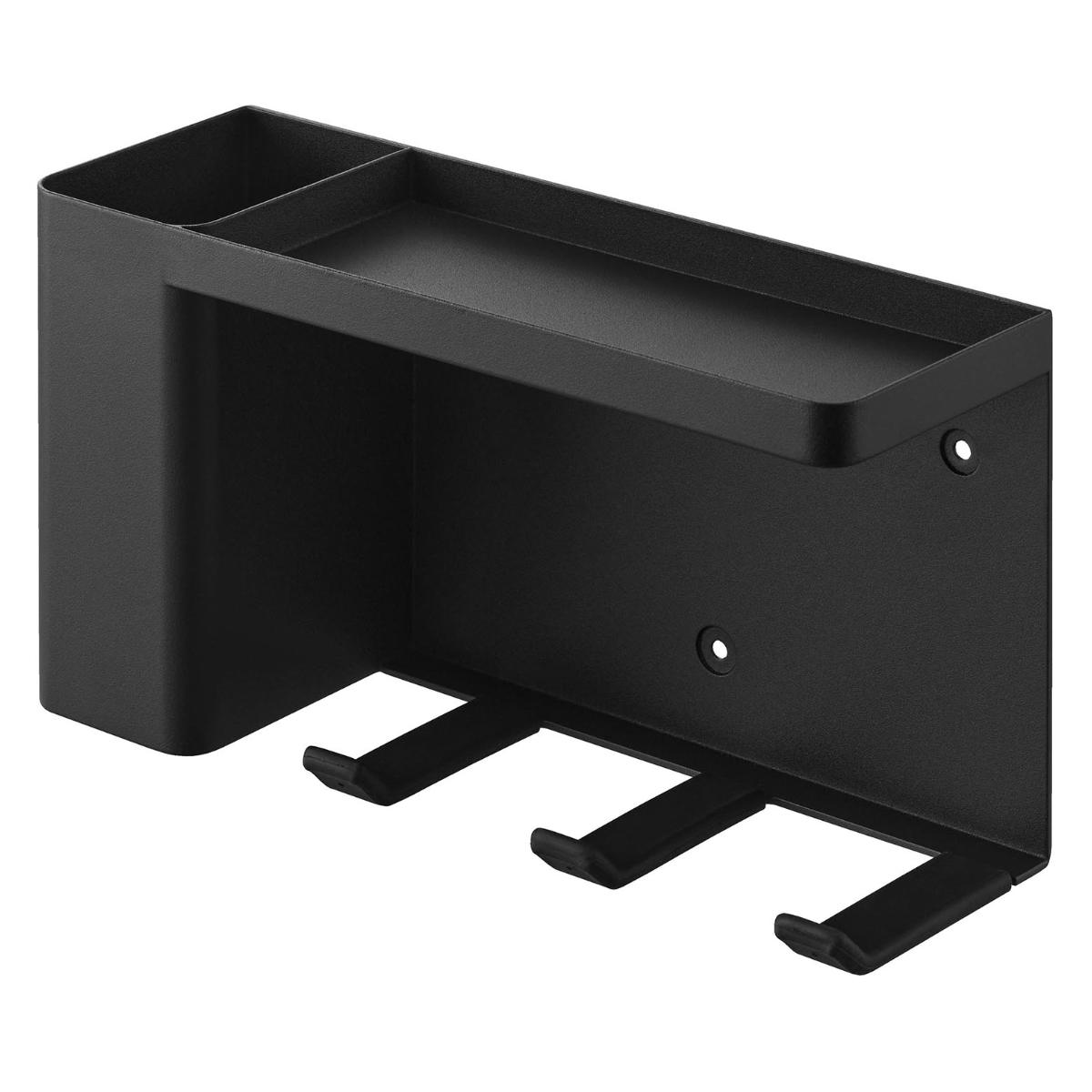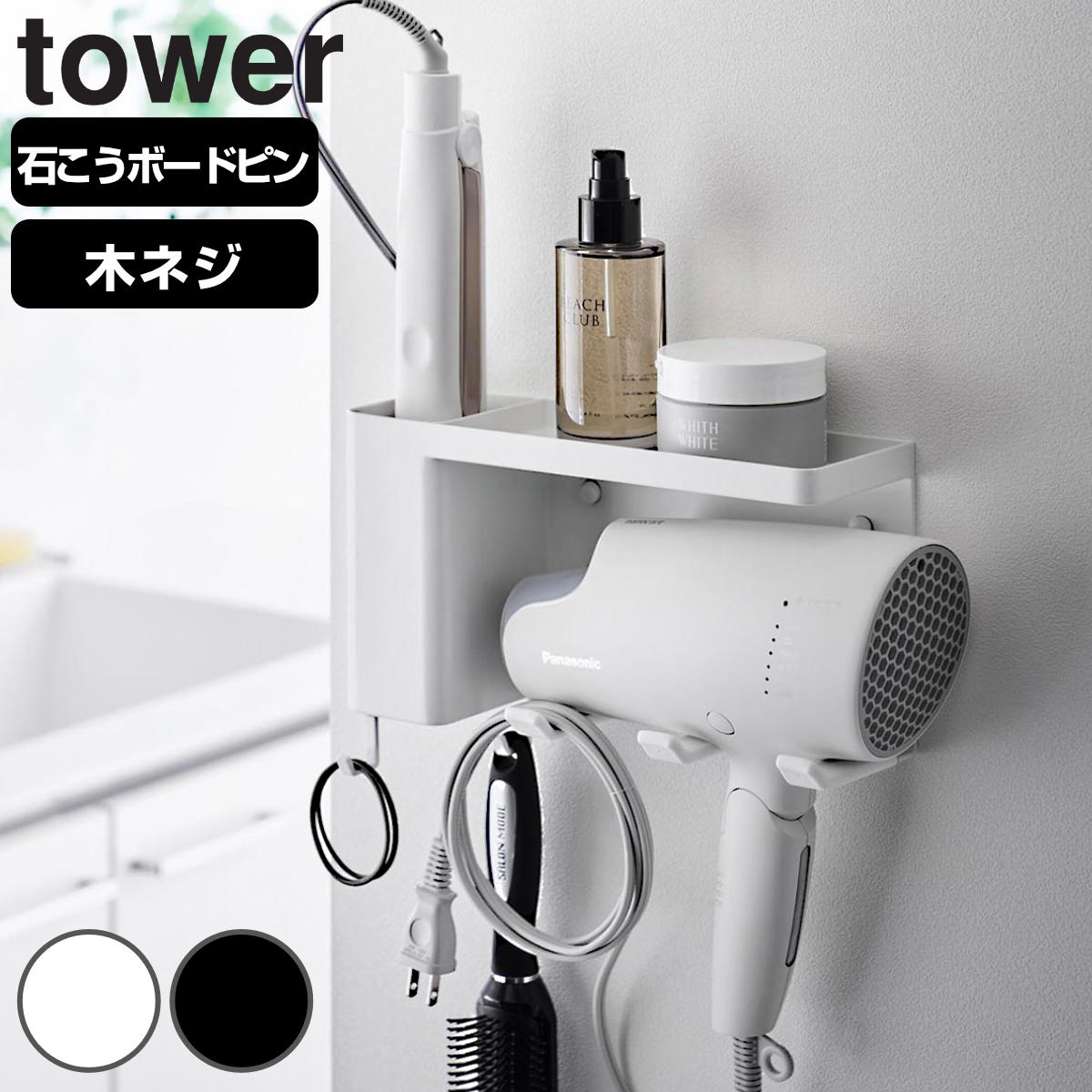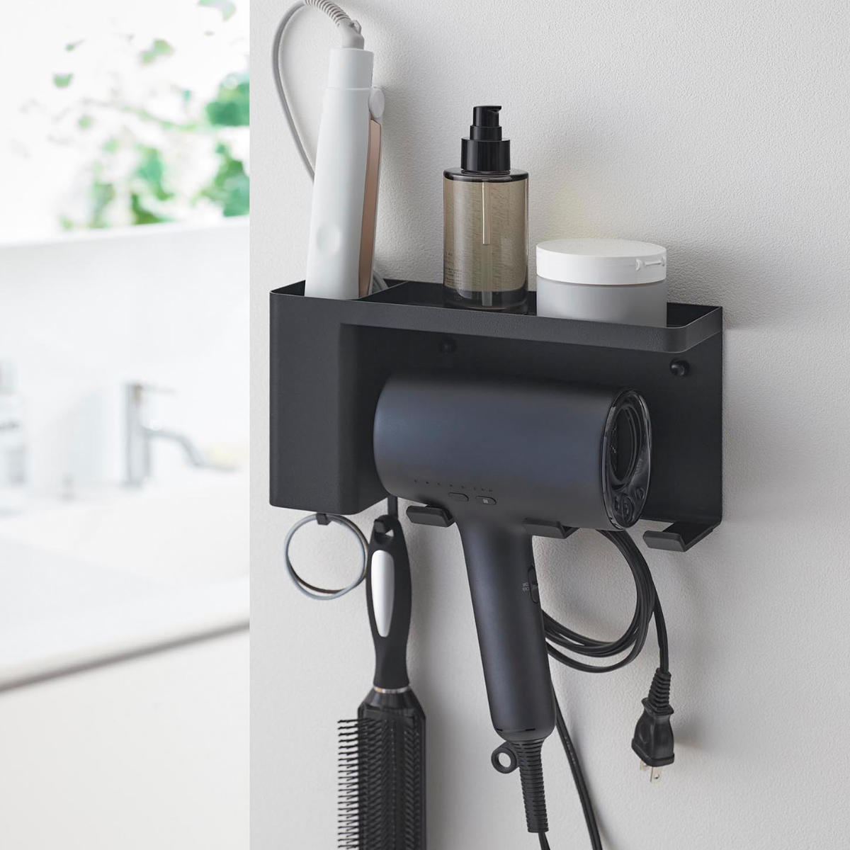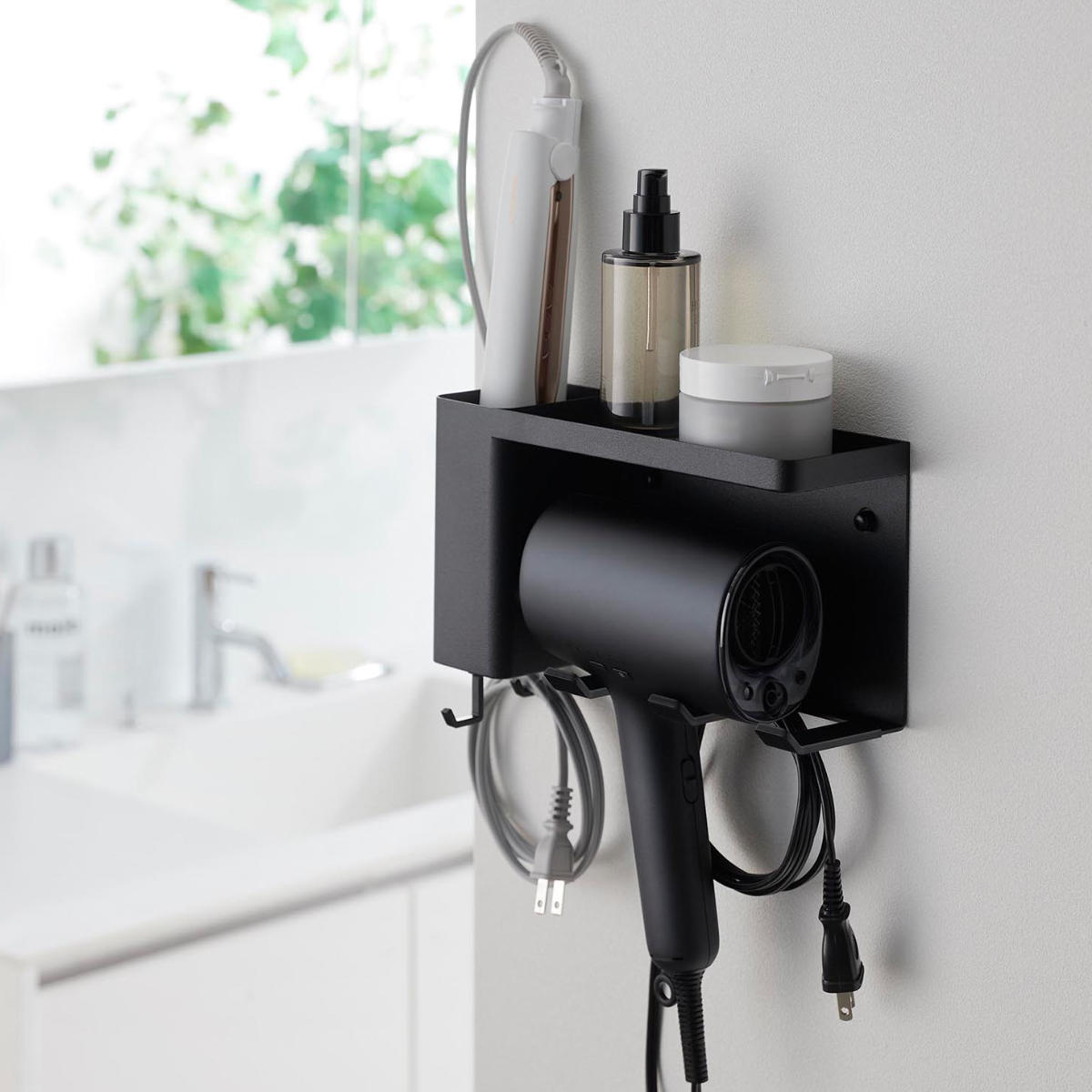山崎実業 tower 壁付けドライヤー&ヘアーアイロンホルダー タワー トレー付き ( 4903208102544 タワーシリーズ ドライヤーホルダー 洗面所 ヘアーアイロンホルダー 壁付け 壁面収納 小物置き トレー ) 【ブラック】
