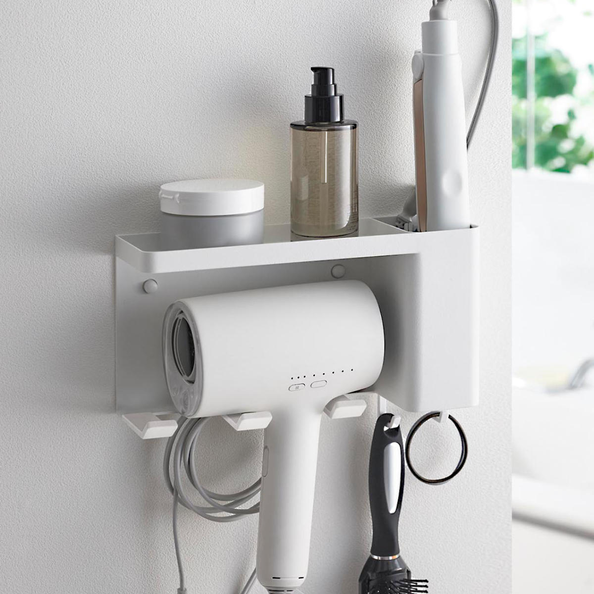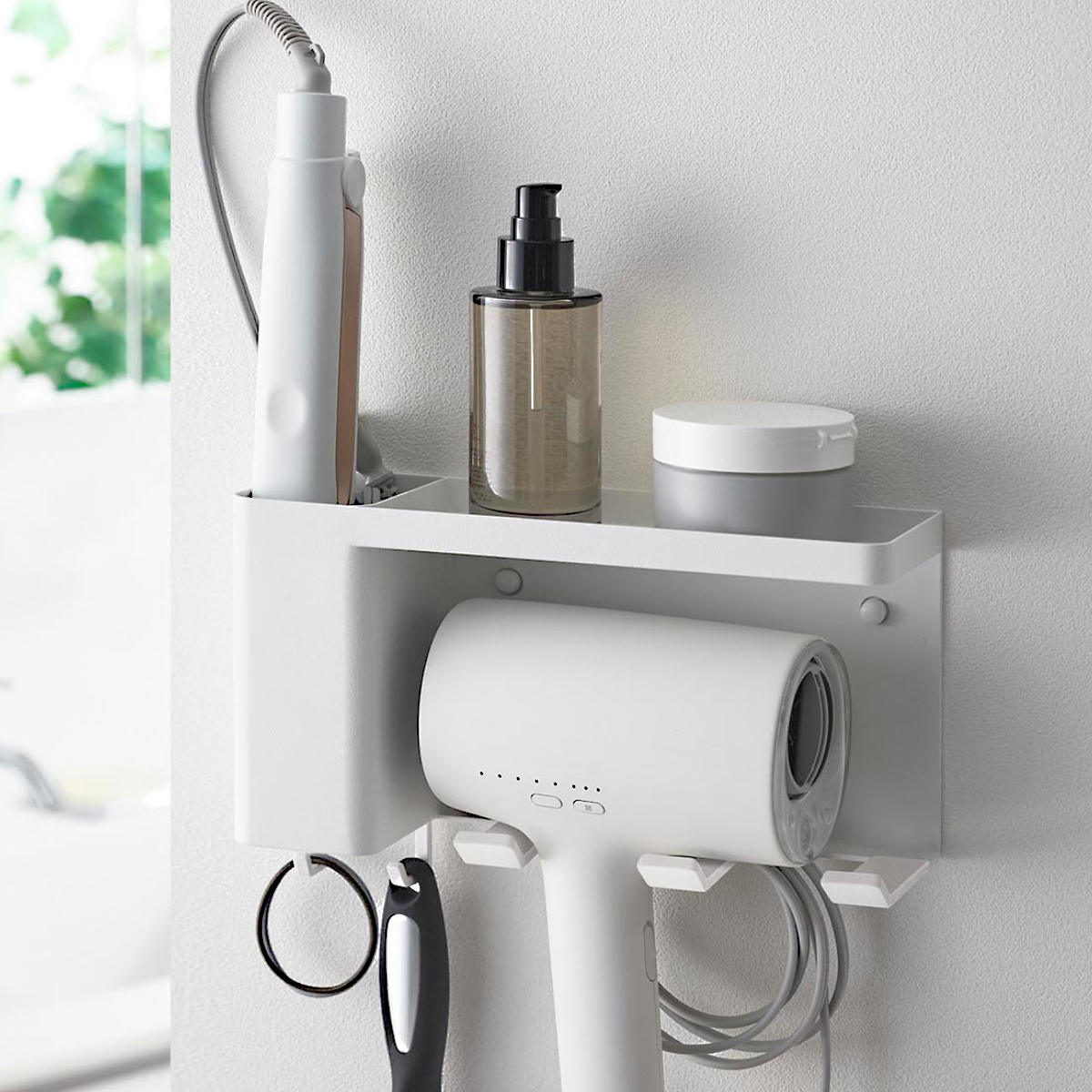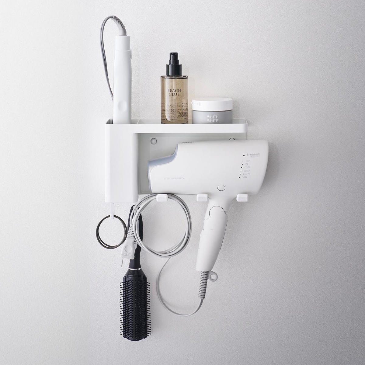 石こうボードピンや木ネジで簡単に設置できる、洗面所用のドライヤーホルダーです。電源コードもホルダー部分に掛けられるので、見た目もすっきり。使いたいときはサッと取り出せて、使用後もすぐに収納できます。