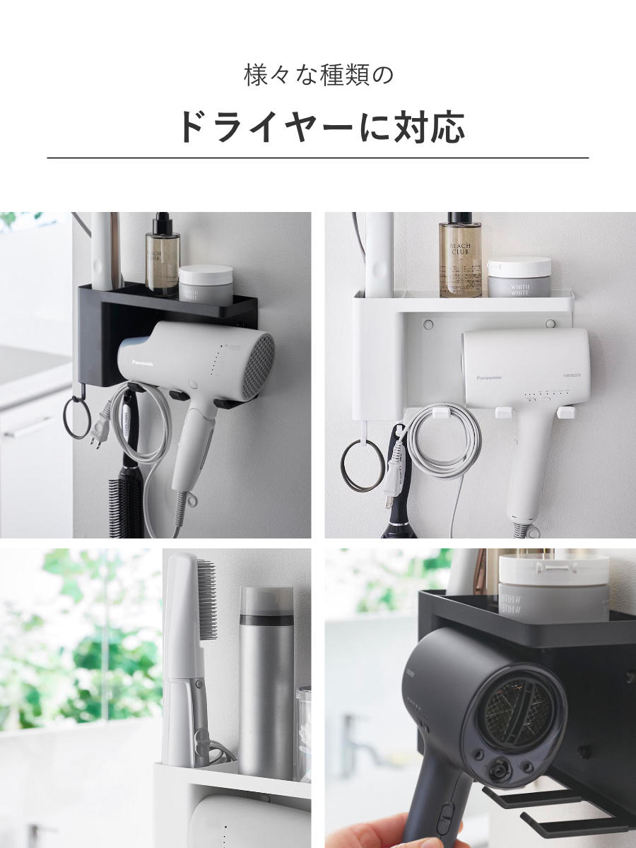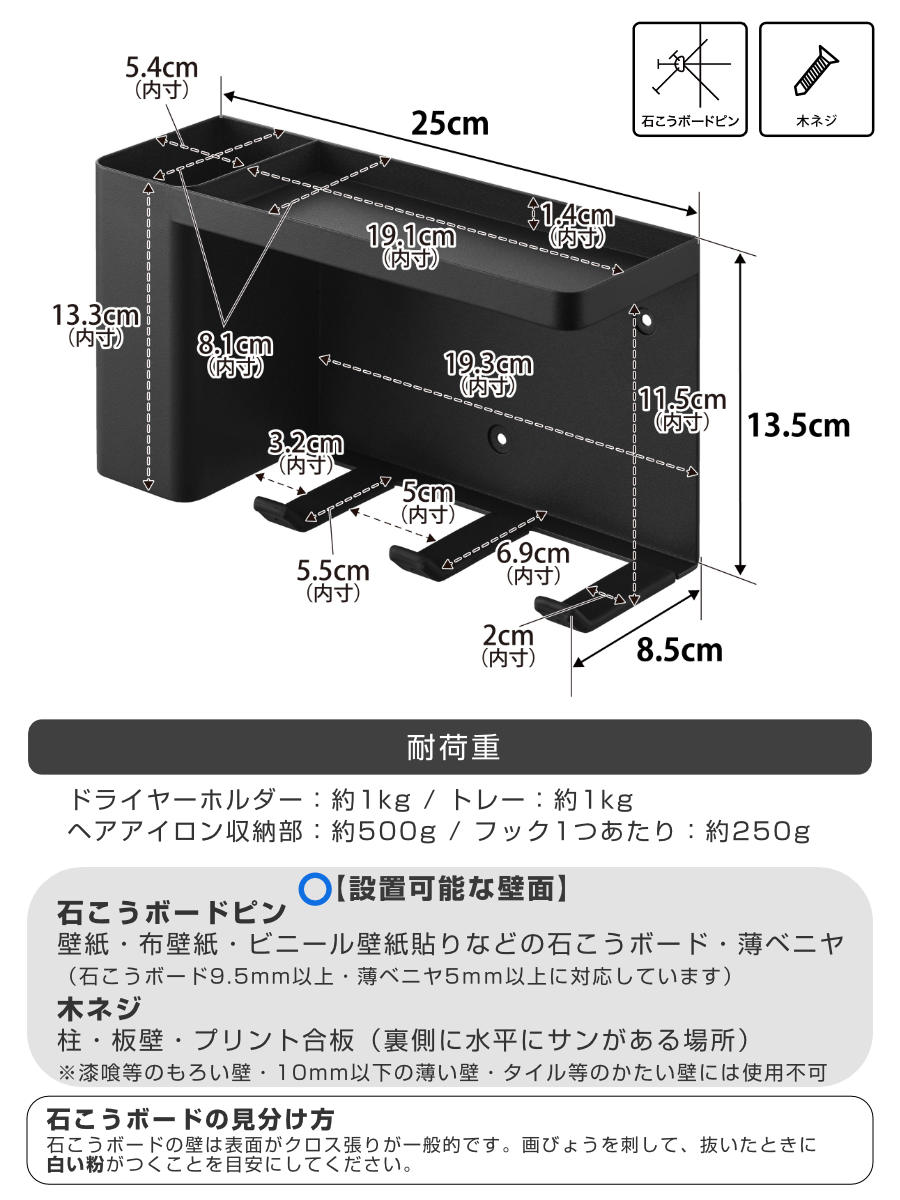 | 耐荷重 | ドライヤーホルダー部:1kg トレー部:1kg ヘアーアイロン収納部:500g フック1つあたり:250g(静止荷重) |
