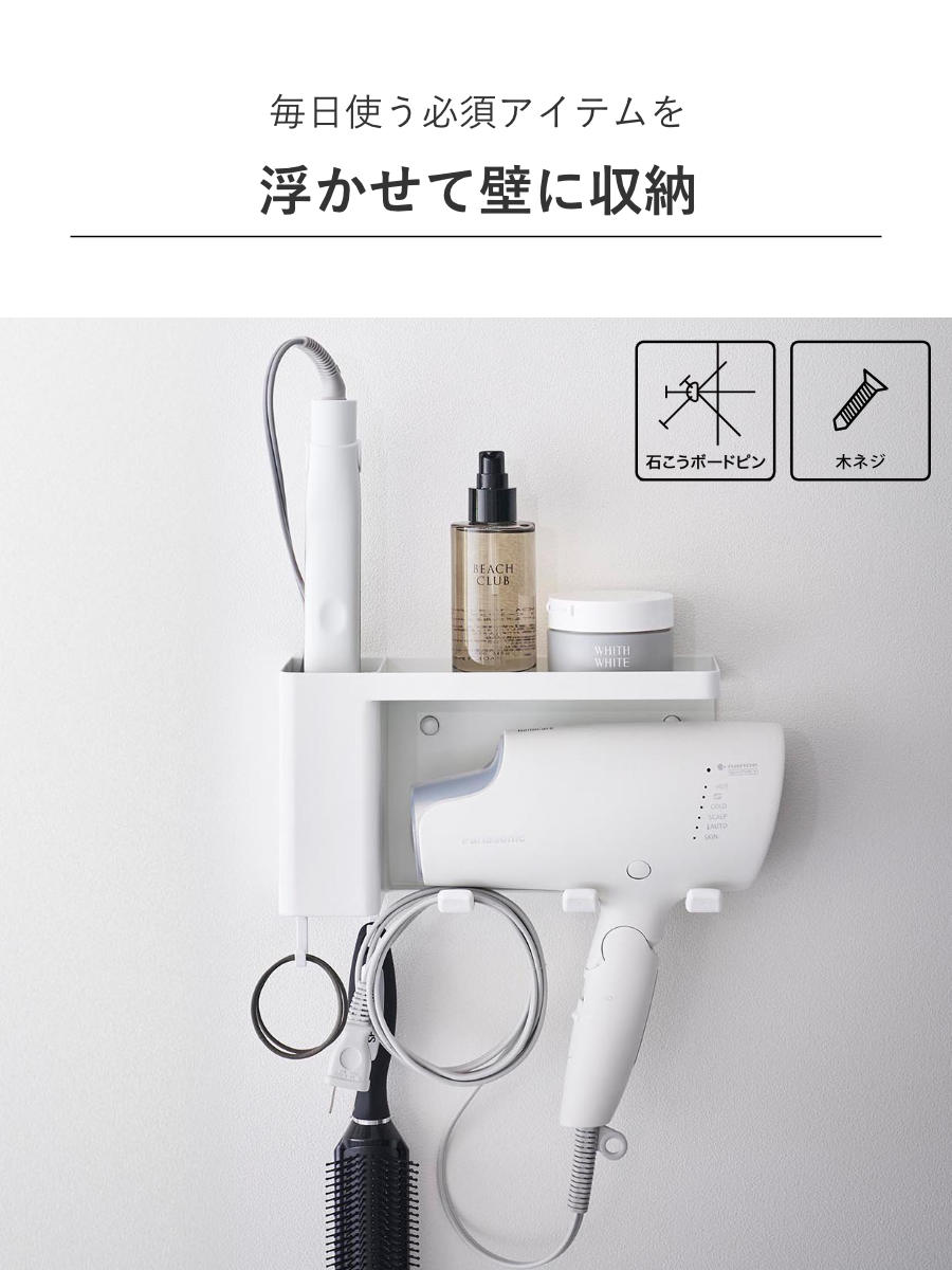 石こうボードピンや木ネジで簡単に設置できる、洗面所用のドライヤーホルダーです。電源コードもホルダー部分に掛けられるので、見た目もすっきり。使いたいときはサッと取り出せて、使用後もすぐに収納できます。
