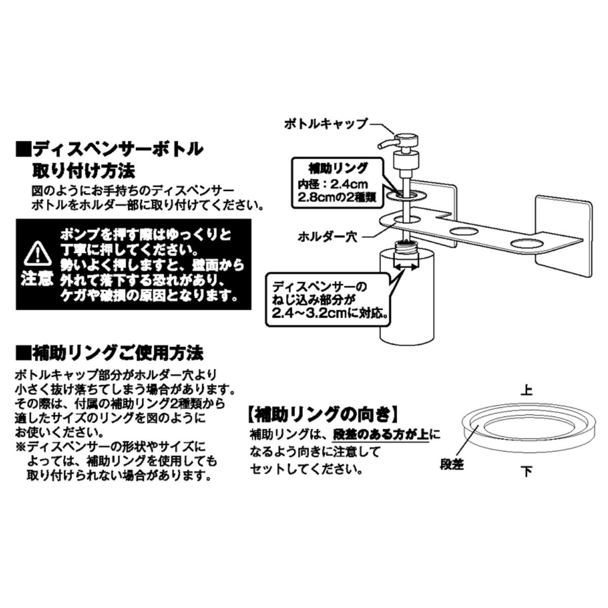 ポンプ部のサイズが直径約2.4cm~3.2cmのディスペンサーに対応しています。補助リングは付属の2サイズから適したサイズのリングをお使い下さい。