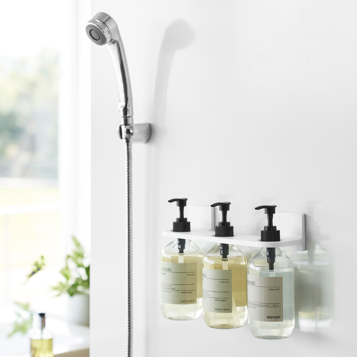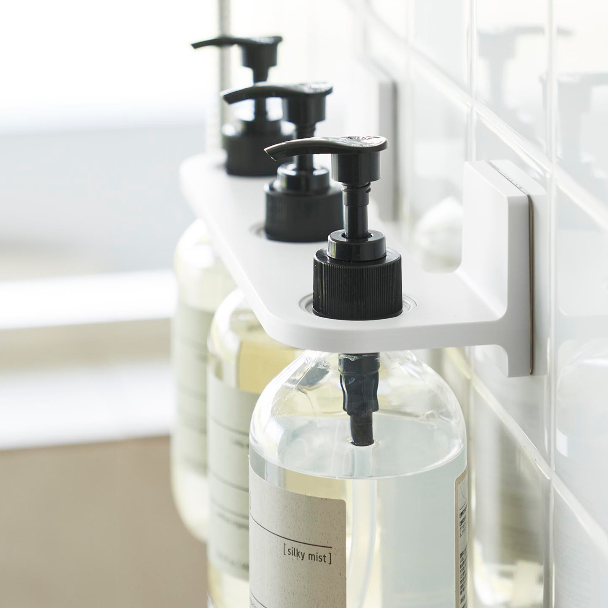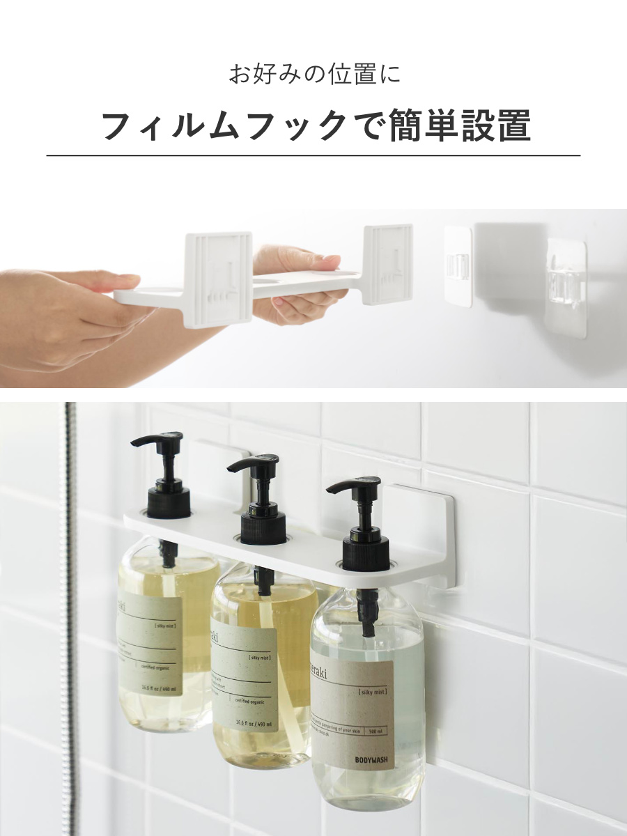 ボディソープやシャンプー、コンディショナーなどのディスペンサーボトル3本を1つのホルダーにまとめてスッキリ収納できます。