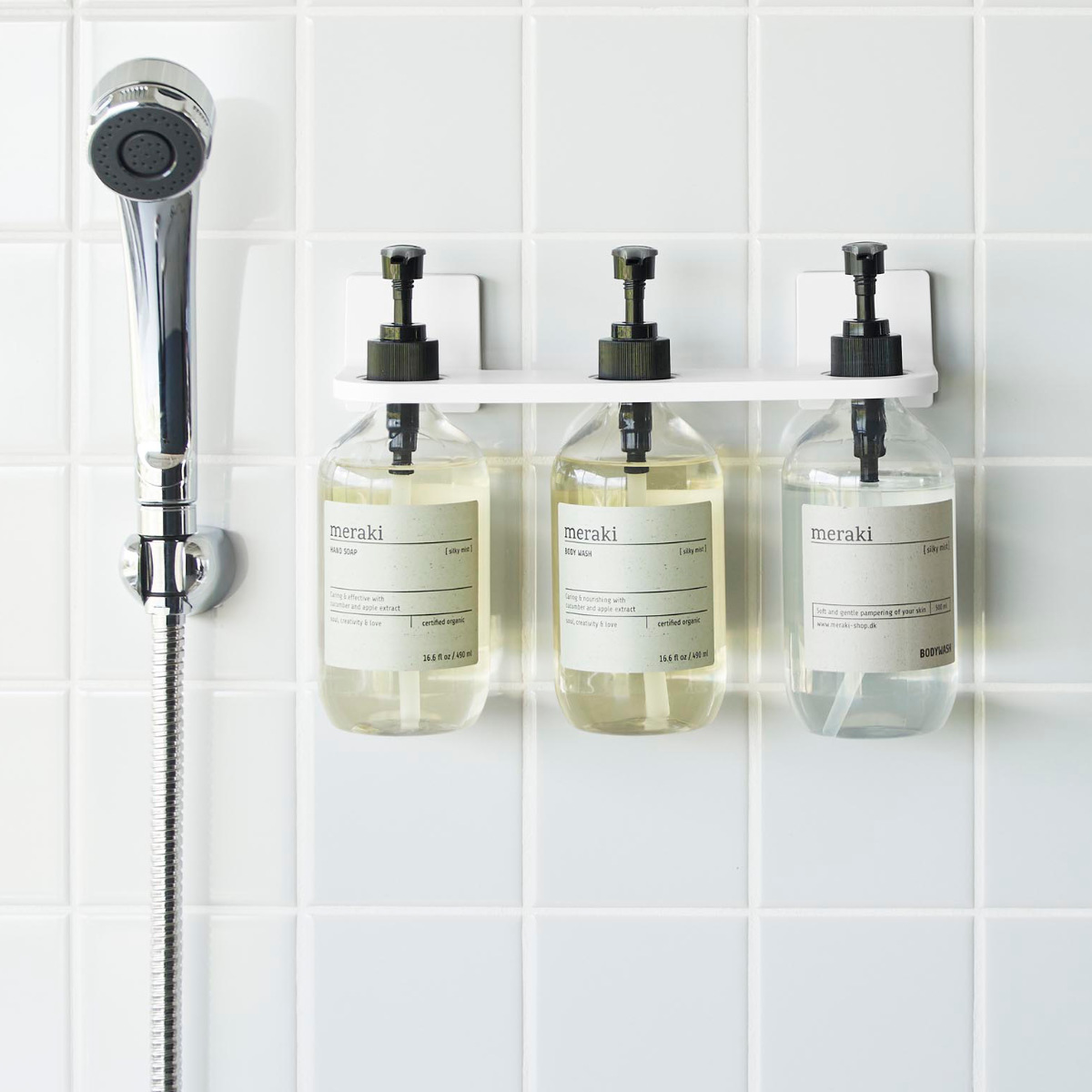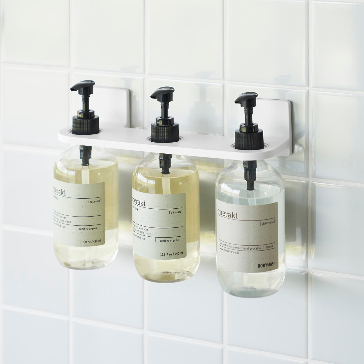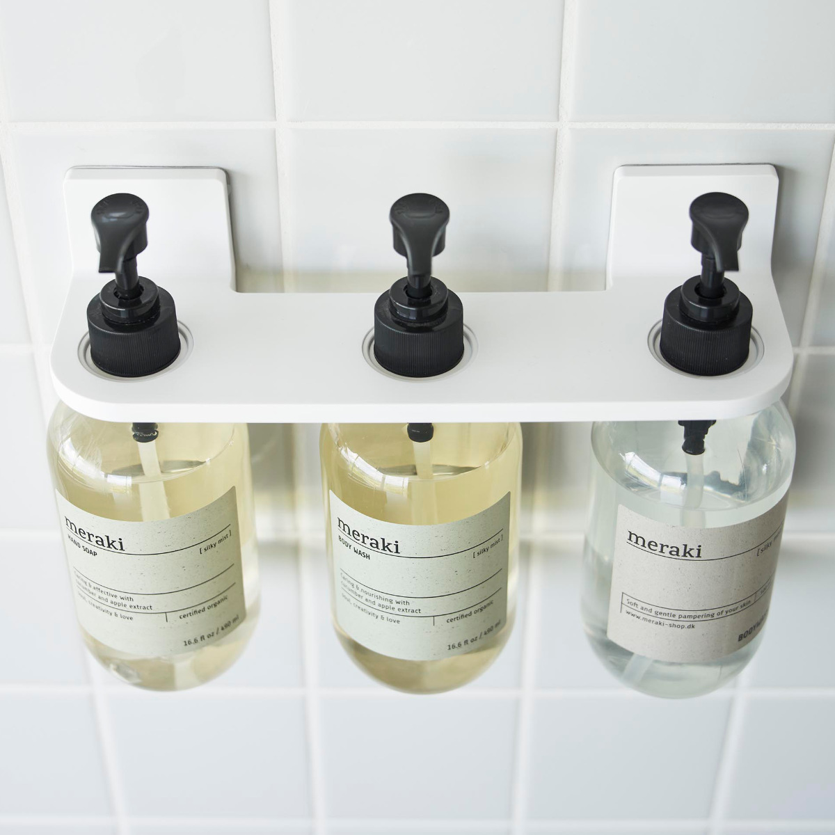 ボディソープやシャンプー、コンディショナーなどのディスペンサーボトル3本を1つのホルダーにまとめてスッキリ収納できます。